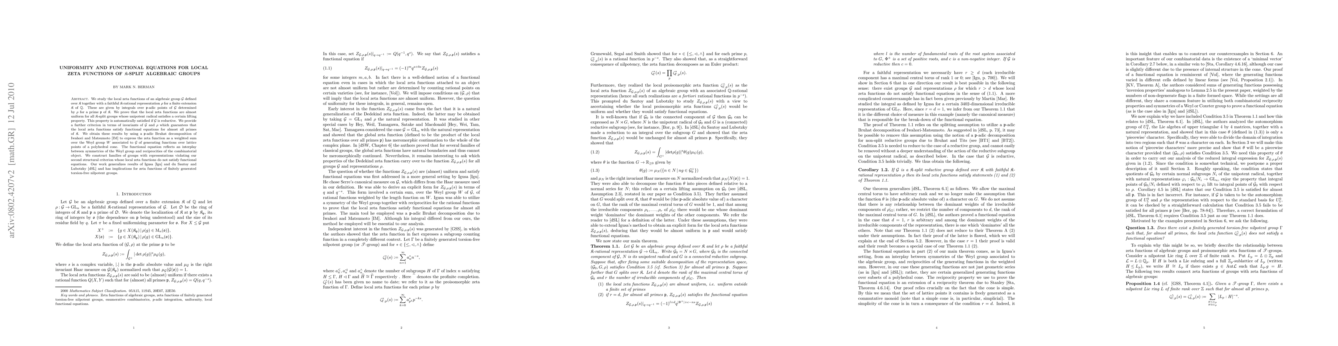 This paper investigates local zeta functions of $\mathfrak{K}$-split algebraic groups over finite extensions of $\mathbb{Q}$ and proves they are almost uniform for reductive groups. It also establishes criteria for these zeta functions to satisfy functional equations, using $\mathfrak{p}$-adic decompositions and Weyl group symmetries.
