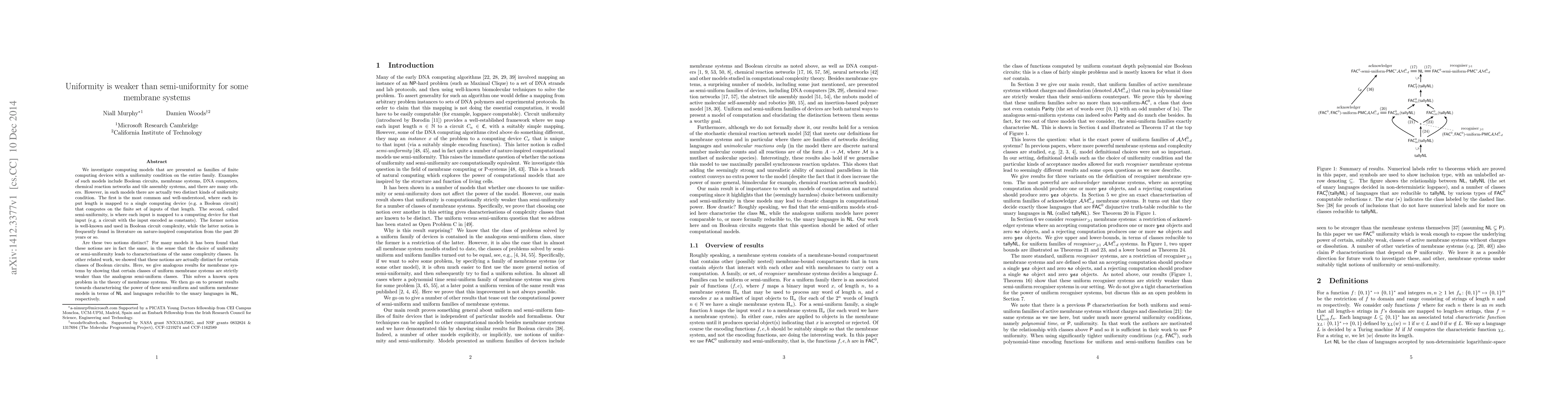 We investigate computing models that are presented as families of finite computing devices with a uniformity condition on the entire family. Examples of such models include Boolean circuits, membrane systems, DNA computers, chemical reaction networks and tile assembly systems, and there are many others. However, in such models there are actually two distinct kinds of uniformity condition. The first is the most common and well-understood, where each input length is mapped to a single computing device (e.g. a Boolean circuit) that computes on the finite set of inputs of that length. The second, called semi-uniformity, is where each input is mapped to a computing device for that input (e.g. a circuit with the input encoded as constants). The former notion is well-known and used in Boolean circuit complexity, while the latter notion is frequently found in literature on nature-inspired computation from the past 20 years or so. Are these two notions distinct? For many models it has been found that these notions are in fact the same, in the sense that the choice of uniformity or semi-uniformity leads to characterisations of the same complexity classes. In other related work, we showed that these notions are actually distinct for certain classes of Boolean circuits. Here, we give analogous results for membrane systems by showing that certain classes of uniform membrane systems are strictly weaker than the analogous semi-uniform classes. This solves a known open problem in the theory of membrane systems. We then go on to present results towards characterising the power of these semi-uniform and uniform membrane models in terms of NL and languages reducible to the unary languages in NL, respectively.