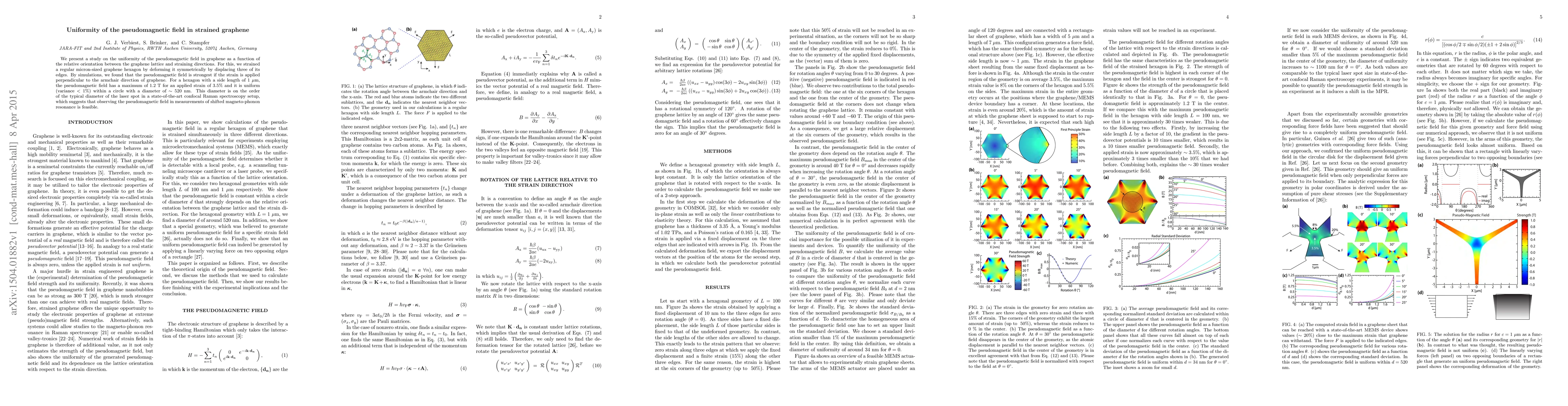 This study investigates the uniformity of the pseudomagnetic field in graphene under strain, finding maximum field strength and uniformity when strain is applied perpendicular to the armchair direction. For a 1 μm hexagon under 3.5% strain, a uniform pseudomagnetic field of up to 1.2 T within a 520 nm diameter circle is achievable, suggesting feasibility for observing this field in confocal Raman spectroscopy.