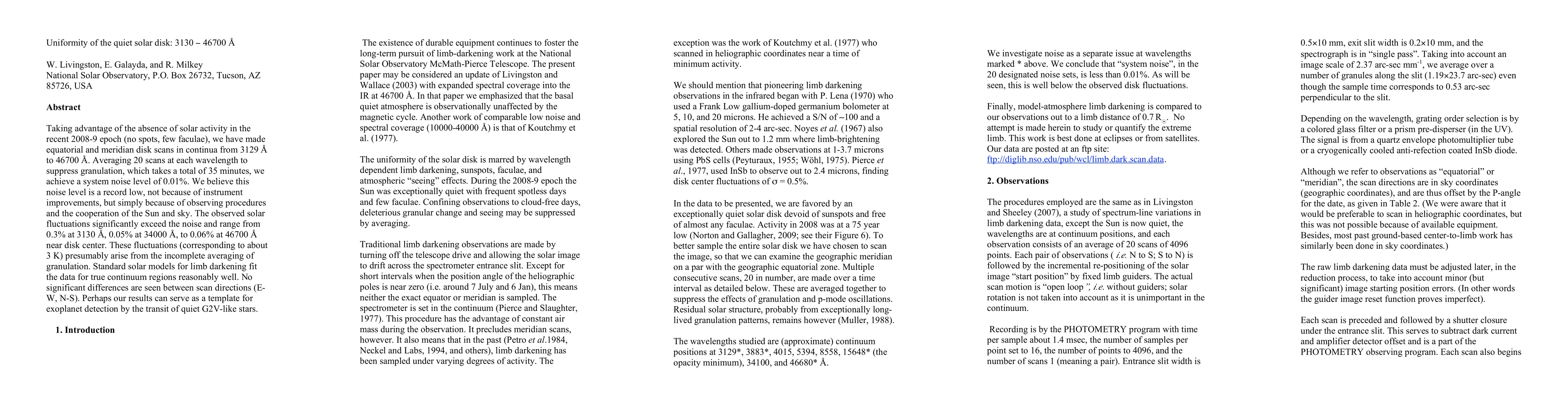 Taking advantage of the absence of solar activity in the recent 2008-9 epoch (no spots, few faculae), we have made equatorial and meridian disk scans in continua from 3129 {\AA} to 46700 {\AA}. Averaging 20 scans at each wavelength to suppress granulation, which takes a total of 35 minutes, we achieve a system noise level of 0.01%. We believe this noise level is a record low, not because of instrument improvements, but simply because of observing procedures and the cooperation of the Sun and sky. The observed solar fluctuations significantly exceed the noise and range from 0.3% at 3130 {\AA}, 0.05% at 34000 {\AA}, to 0.06% at 46700 {\AA} near disk center. These fluctuations (corresponding to about 3 K) presumably arise from the incomplete averaging of granulation. Standard solar models for limb darkening fit the data for true continuum regions reasonably well. No significant differences are seen between scan directions (EW, N-S). Perhaps our results can serve as a template for exoplanet detection by the transit of quiet G2V-like stars.
