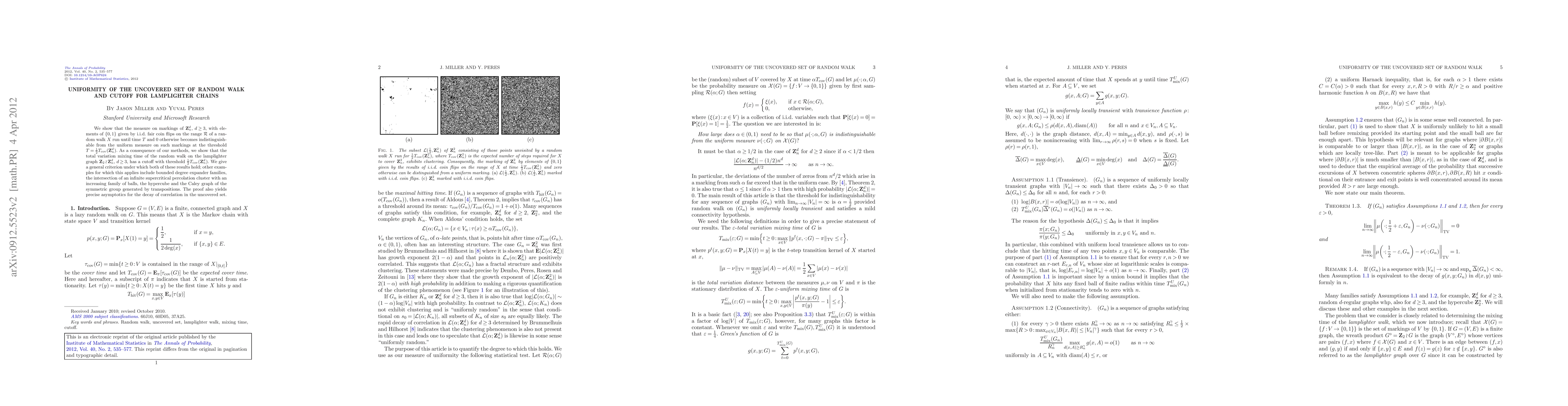 We show that the measure on markings of $\mathbf {Z}_n^d$, $d\geq3$, with elements of ${0,1}$ given by i.i.d. fair coin flips on the range $\mathcal {R}$ of a random walk $X$ run until time $T$ and 0 otherwise becomes indistinguishable from the uniform measure on such markings at the threshold $T=1/2T_{{\mathrm {cov}}}(\mathbf {Z}_n^d)$. As a consequence of our methods, we show that the total variation mixing time of the random walk on the lamplighter graph $\mathbf {Z}_2\wr \mathbf {Z}_n^d$, $d\geq3$, has a cutoff with threshold $1/2T_{{\mathrm {cov}}}(\mathbf {Z}_n^d)$. We give a general criterion under which both of these results hold; other examples for which this applies include bounded degree expander families, the intersection of an infinite supercritical percolation cluster with an increasing family of balls, the hypercube and the Caley graph of the symmetric group generated by transpositions. The proof also yields precise asymptotics for the decay of correlation in the uncovered set.