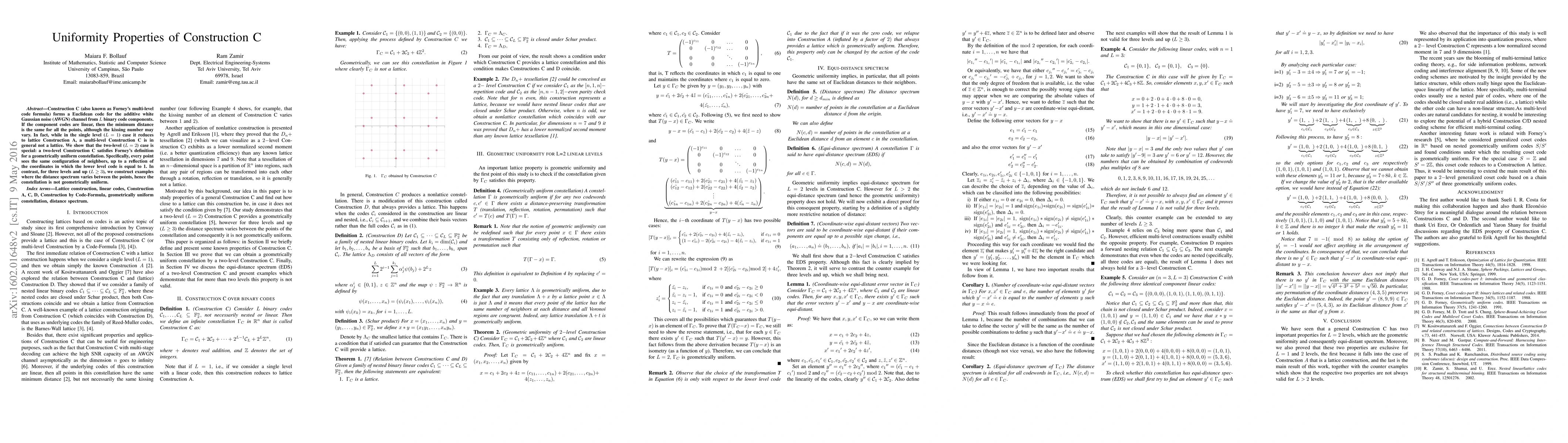 A research paper explores Construction C codes for additive white Gaussian noise channels and finds that only two-level Construction C codes satisfy geometric uniformity in terms of neighbor configurations.