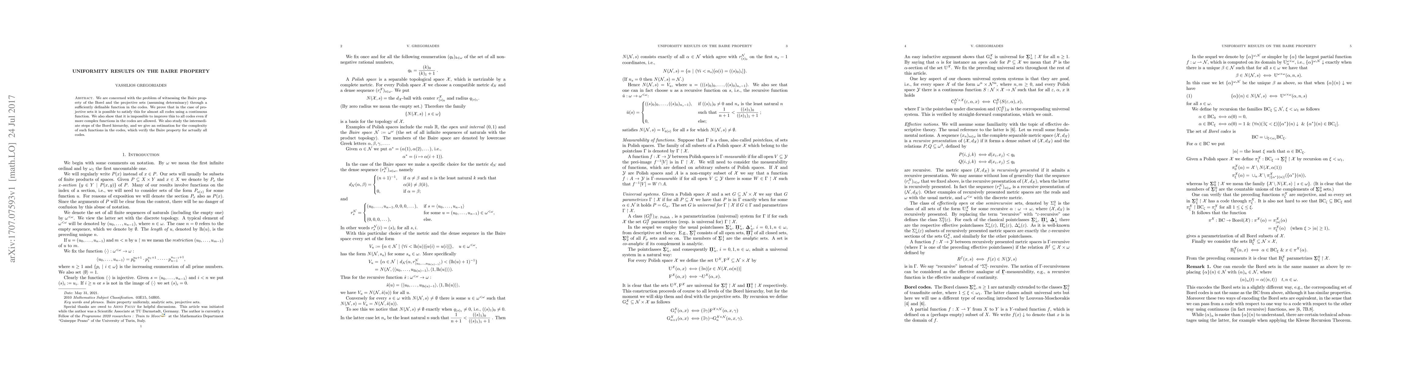 The paper introduces uniformity results on the Baire property, demonstrating the existence of continuous functions that witness the Baire property for almost all codes in projective sets and providing estimations for complexity at intermediate Borel hierarchy levels.
