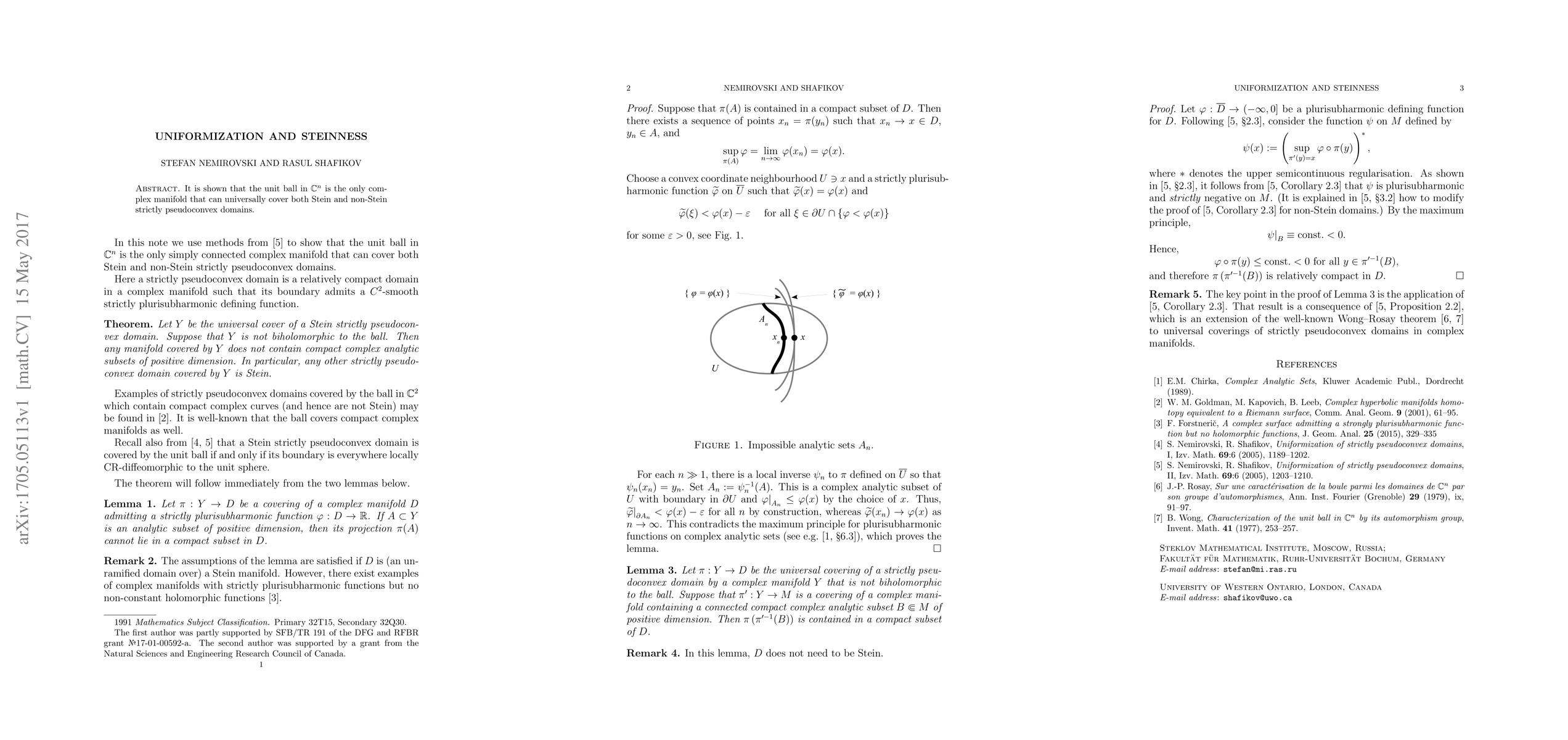 It is shown that the unit ball in ${\mathbb C}^n$ is the only complex manifold that can universally cover both Stein and non-Stein strictly pseudoconvex domains.
