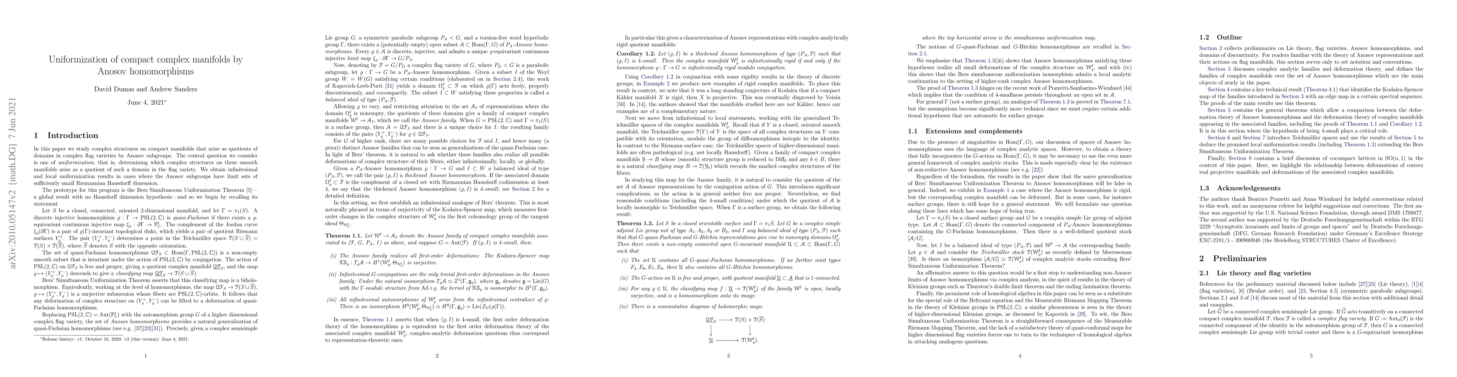 We study uniformization problems for compact manifolds that arise as quotients of domains in complex flag varieties by images of Anosov homomorphisms. We focus on Anosov homomorphisms with "small" limit sets, as measured by the Riemannian Hausdorff codimension in the flag variety. Under such a codimension hypothesis, we show that all first-order deformations of complex structure on the associated compact complex manifolds are realized by deformations of the Anosov homomorphism. With some mild additional hypotheses we show that the character variety maps locally homeomorphically to the (generalized) Teichm\"uller space of the manifold. In particular this provides a local analogue of the Bers Simultaneous Uniformization Theorem in the setting of Anosov homomorphisms to higher-rank complex semisimple Lie groups.