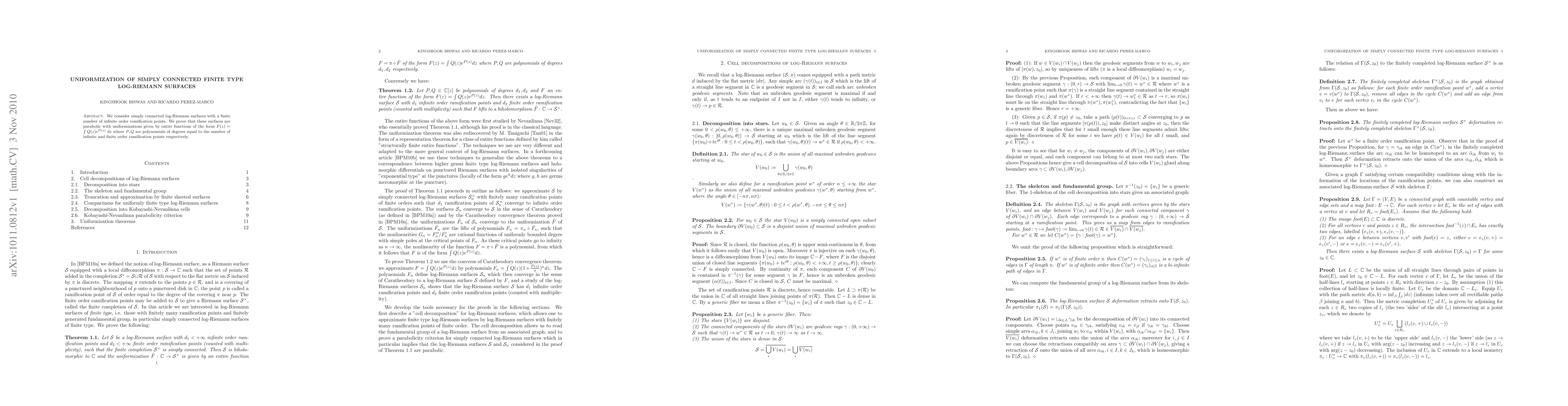 We consider simply connected log-Riemann surfaces with a finite number of ramification points. We prove that these surfaces are biholomorphic to C with uniformizations given by entire functions of the form F (z) = \int Q(z) e^{P(z)} dz where P, Q are polynomials of degrees equal to the number of infinite and finite order ramification points respectively. Conversely any such entire function defines a simply connected log-Riemann surface with finitely many ramification points.