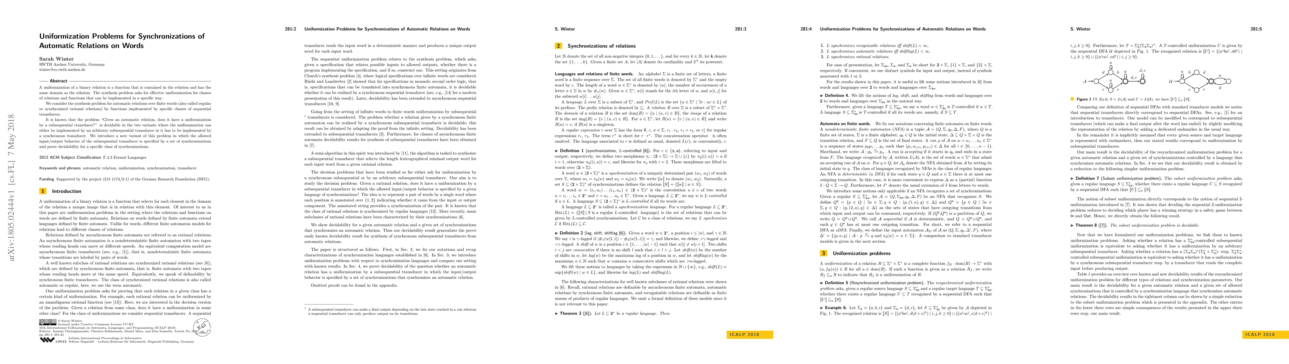 Summary: This paper investigates the decidability of uniformizing automatic relations over finite words using specific classes of sequential transducers. It introduces a new variant where uniformization is constrained by specified synchronizations, and proves the decidability for a particular class of these synchronizations.