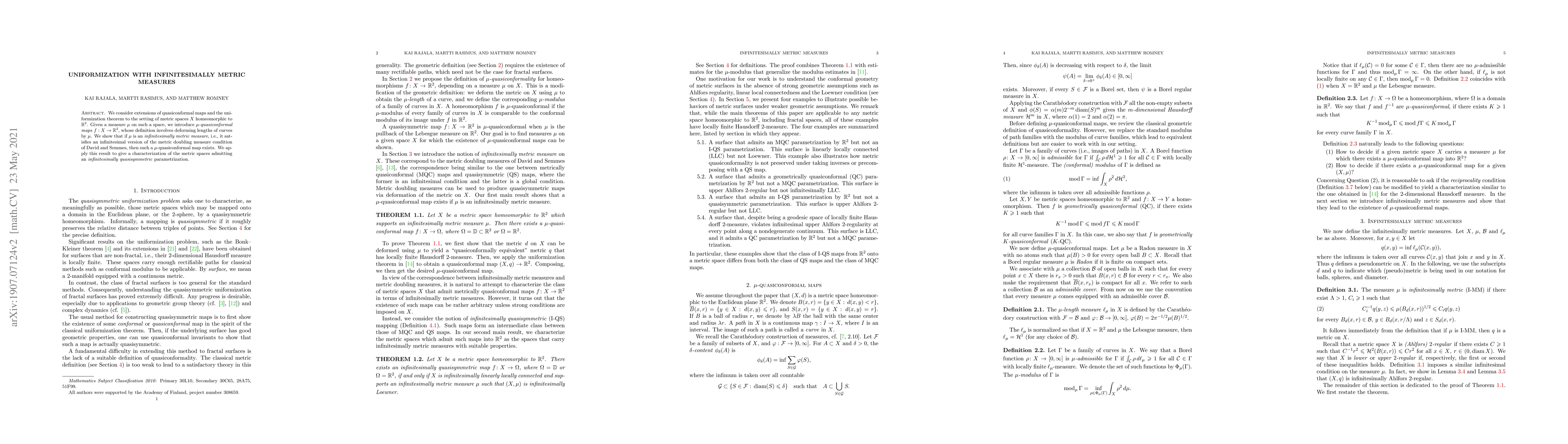 We consider extensions of quasiconformal maps and the uniformization theorem to the setting of metric spaces $X$ homeomorphic to $\mathbb R^2$. Given a measure $\mu$ on such a space, we introduce $\mu$-quasiconformal maps $f:X \to \mathbb R^2$, whose definition involves deforming lengths of curves by $\mu$. We show that if $\mu$ is an infinitesimally metric measure, i.e., it satisfies an infinitesimal version of the metric doubling measure condition of David and Semmes, then such a $\mu$-quasiconformal map exists. We apply this result to give a characterization of the metric spaces admitting an infinitesimally quasisymmetric parametrization.