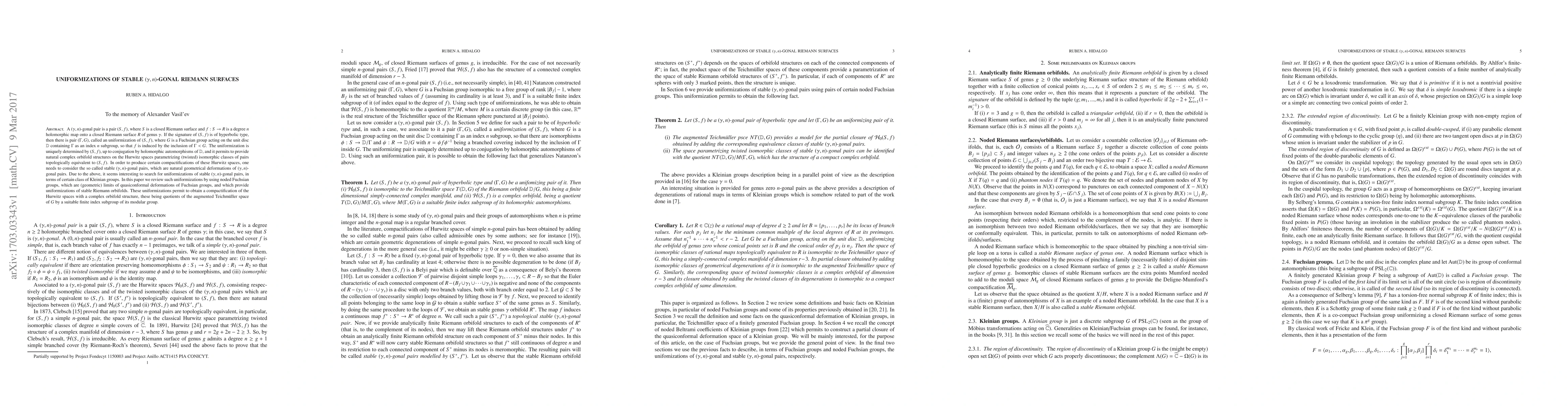 This paper explores uniformizations of stable $(\gamma,n)$-gonal Riemann surfaces using noded Fuchsian groups, which are limits of quasiconformal deformations of Fuchsian groups. These uniformizations provide a compactification of Hurwitz spaces with a natural complex orbifold structure.