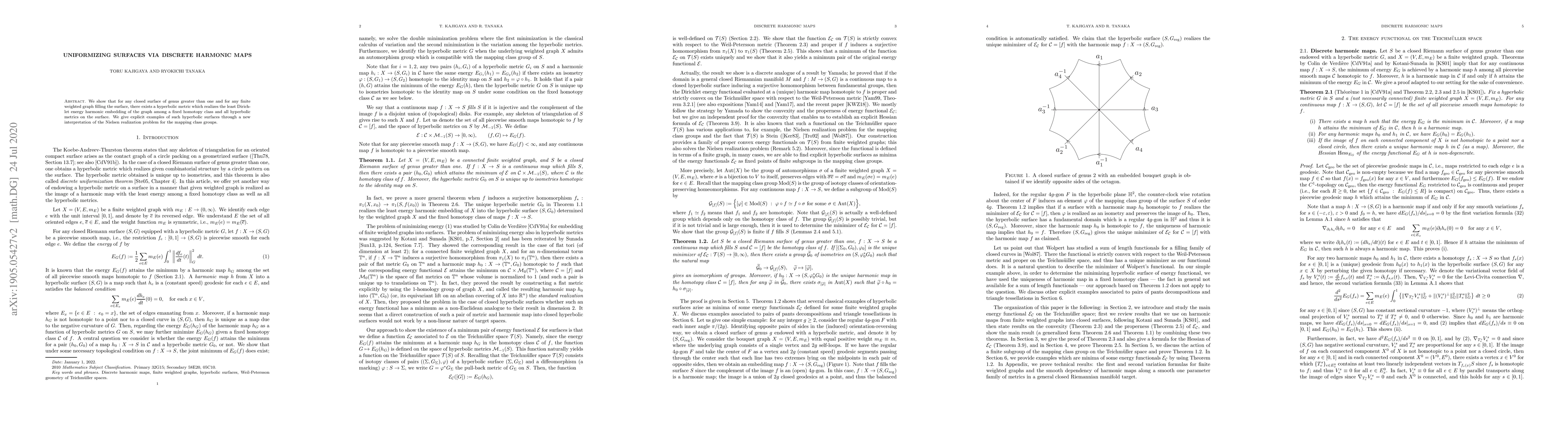 We show that for any closed surface of genus greater than one and for any finite weighted graph filling the surface, there exists a hyperbolic metric which realizes the least Dirichlet energy harmonic embedding of the graph among a fixed homotopy class and all hyperbolic metrics on the surface. We give explicit examples of such hyperbolic surfaces through a new interpretation of the Nielsen realization problem for the mapping class groups.