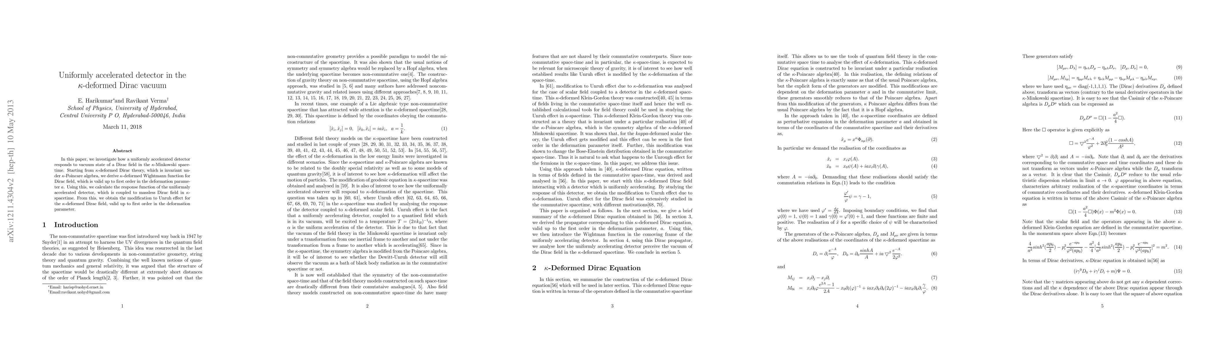 This paper examines the response of a uniformly accelerated detector to the vacuum state of a Dirac field in $\kappa$-Minkowski space-time, deriving a $\kappa$-deformed Wightmann function and calculating the detector's response function, which modifies the Unruh effect up to first order in the deformation parameter.