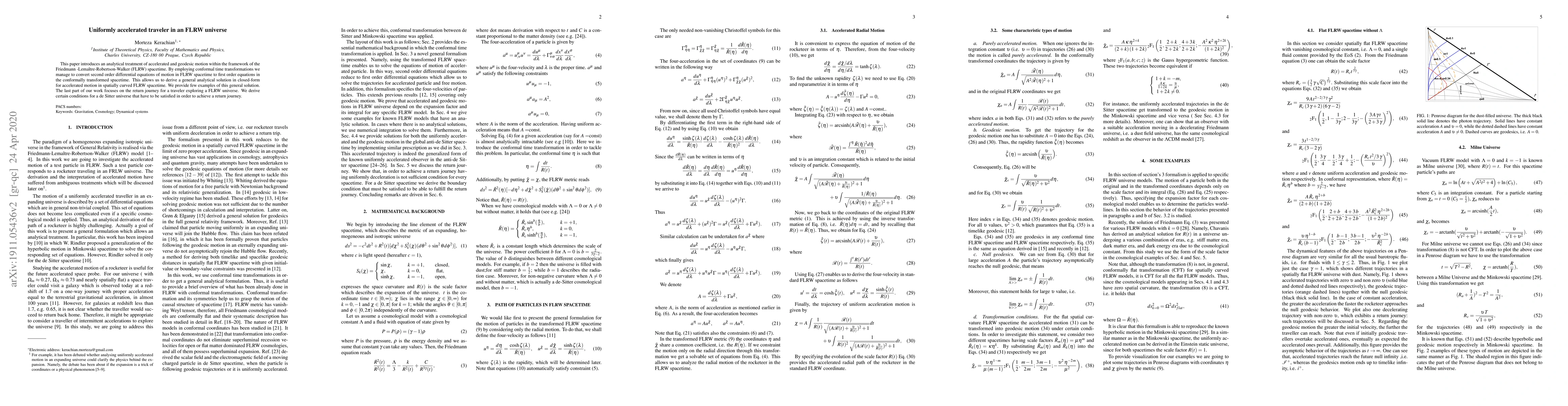This paper analytically treats accelerated motion in an FLRW universe by transforming second-order differential equations into first-order ones using conformal time, yielding a closed-form solution for accelerated travel. It also explores return journeys in a de Sitter universe, deriving conditions for feasible return trips.