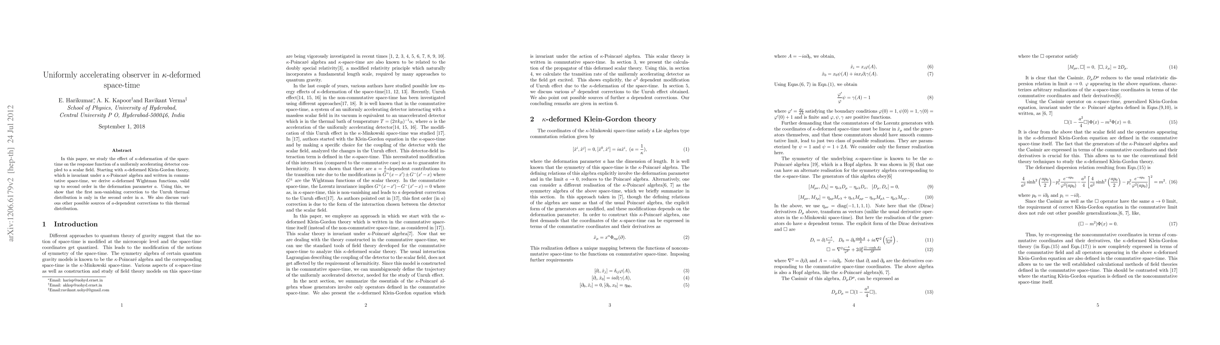 This research is important for understanding the effects of $\kappa$-deformation on uniformly accelerating observers and contributes to the theoretical framework of quantum field theory in deformed space-times.