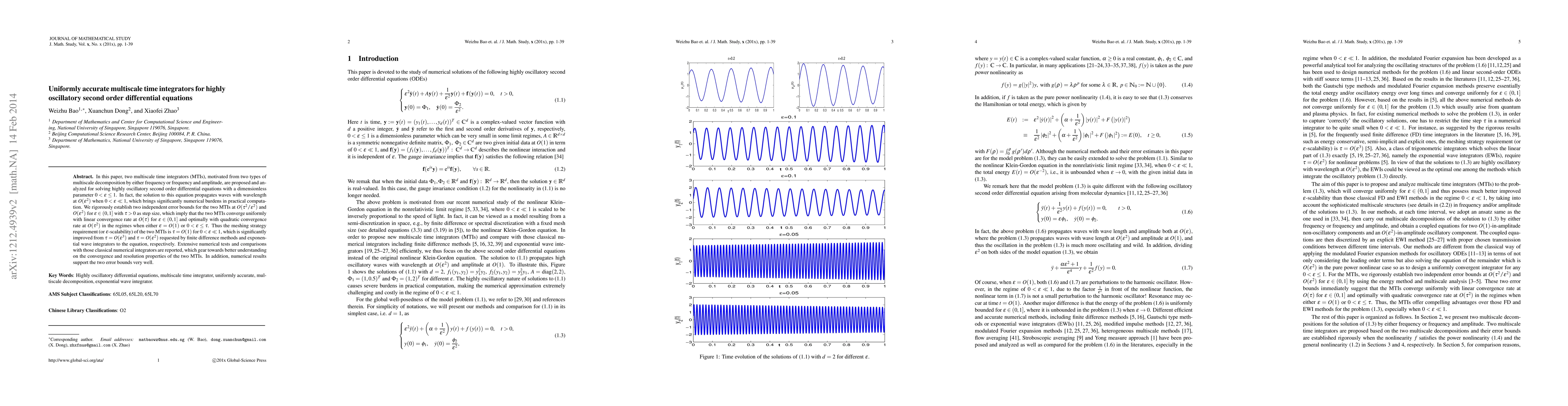In this paper, two multiscale time integrators (MTIs), motivated from two types of multiscale decomposition by either frequency or frequency and amplitude, are proposed and analyzed for solving highly oscillatory second order differential equations with a dimensionless parameter $0<\varepsilon\le1$. In fact, the solution to this equation propagates waves with wavelength at $O(\varepsilon^2)$ when $0<\varepsilon\ll 1$, which brings significantly numerical burdens in practical computation. We rigorously establish two independent error bounds for the two MTIs at $O(\tau^2/\varepsilon^2)$ and $O(\varepsilon^2)$ for $\varepsilon\in(0,1]$ with $\tau>0$ as step size, which imply that the two MTIs converge uniformly with linear convergence rate at $O(\tau)$ for $\varepsilon\in(0,1]$ and optimally with quadratic convergence rate at $O(\tau^2)$ in the regimes when either $\varepsilon=O(1)$ or $0<\varepsilon\le \tau$. Thus the meshing strategy requirement (or $\varepsilon$-scalability) of the two MTIs is $\tau=O(1)$ for $0<\varepsilon\ll 1$, which is significantly improved from $\tau=O(\varepsilon^3)$ and $\tau=O(\varepsilon^2)$ requested by finite difference methods and exponential wave integrators to the equation, respectively. Extensive numerical tests and comparisons with those classical numerical integrators are reported, which gear towards better understanding on the convergence and resolution properties of the two MTIs. In addition, numerical results support the two error bounds very well.