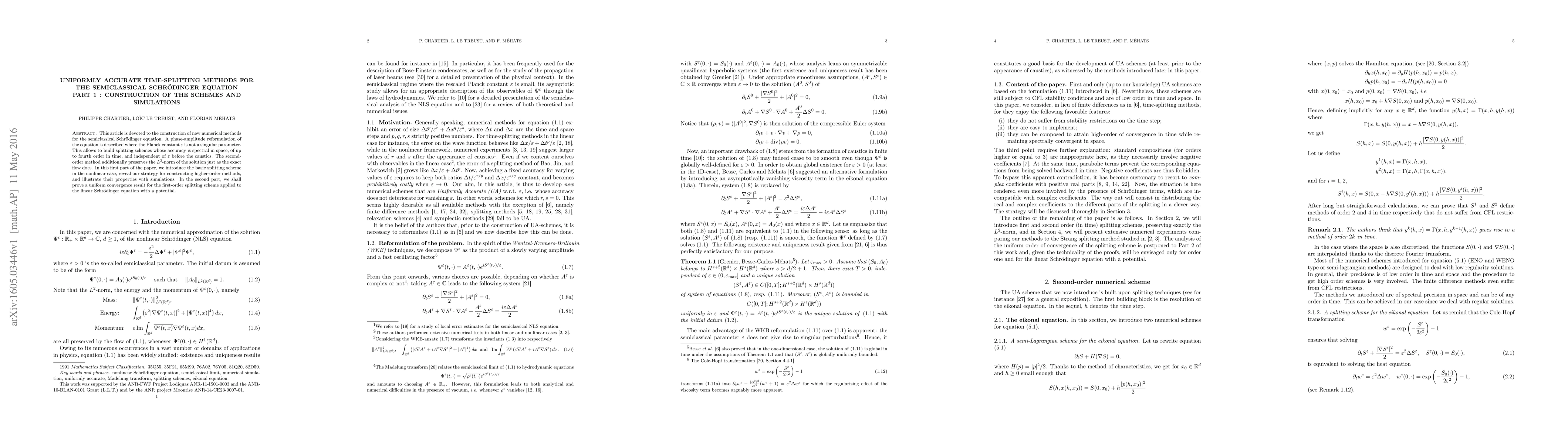 This article is devoted to the construction of new numerical methods for the semiclassical Schr\"odinger equation. A phase-amplitude reformulation of the equation is described where the Planck constant epsilon is not a singular parameter. This allows to build splitting schemes whose accuracy is spectral in space, of up to fourth order in time, and independent of epsilon before the caustics. The second-order method additionally preserves the L^2-norm of the solution just as the exact flow does. In this first part of the paper, we introduce the basic splitting scheme in the nonlinear case, reveal our strategy for constructing higher-order methods, and illustrate their properties with simulations. In the second part, we shall prove a uniform convergence result for the first-order splitting scheme applied to the linear Schr\"odinger equation with a potential.