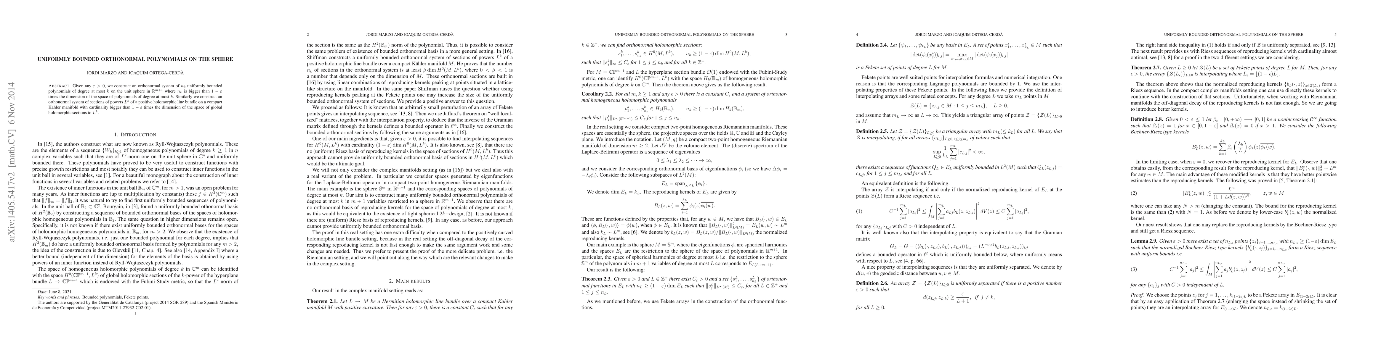 Given any $\varepsilon>0$, we construct an orthonormal system of $n_k$ uniformly bounded polynomials of degree at most $k$ on the unit sphere in $\mathbb R^{m+1}$ where $n_k$ is bigger than $1-\varepsilon$ times the dimension of the space of polynomials of degree at most $k$. Similarly we construct an orthonormal system of sections of powers $L^k$ of a positive holomorphic line bundle on a compact K\"ahler manifold with cardinality bigger than $1-\varepsilon$ times the dimension of the space of global holomorphic sections to $L^k$.