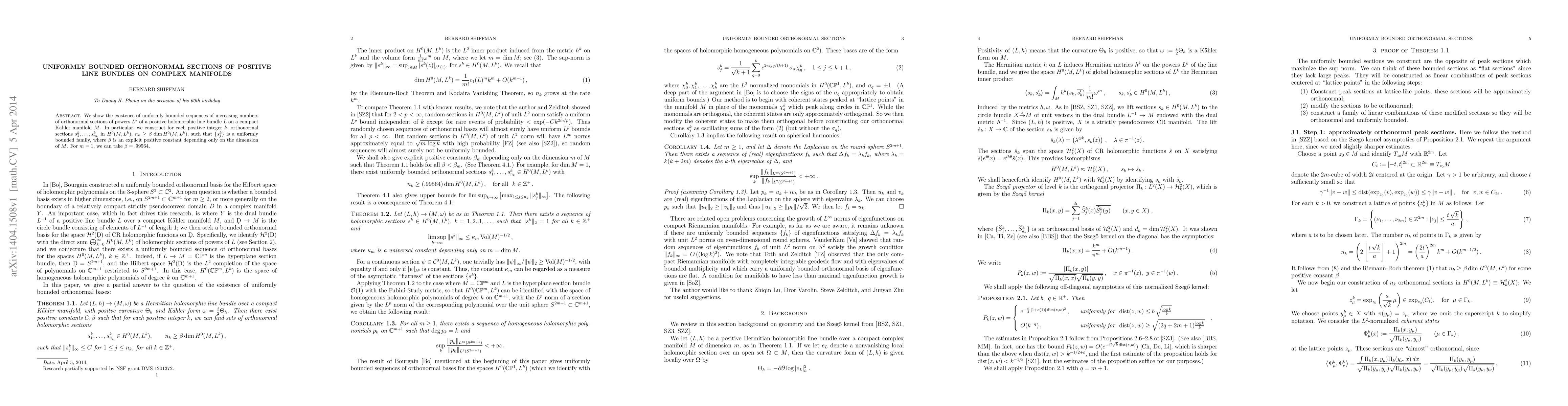 We show the existence of uniformly bounded sequences of increasing numbers of orthonormal sections of powers $L^k$ of a positive holomorphic line bundle $L$ on a compact K\"ahler manifold $M$. In particular, we construct for each positive integer $k$, orthonormal sections $s^k_1,\dots,s^k_{n_k}$ in $H^0(M,L^k)$, $n_k\ge\beta\dim H^0(M,L^k)$, such that $\{s^k_j\}$ is a uniformly bounded family, where $\beta$ is an explicit positive constant depending only on the dimension of $M$. For $m=1$, we can take $\beta=.99564$.