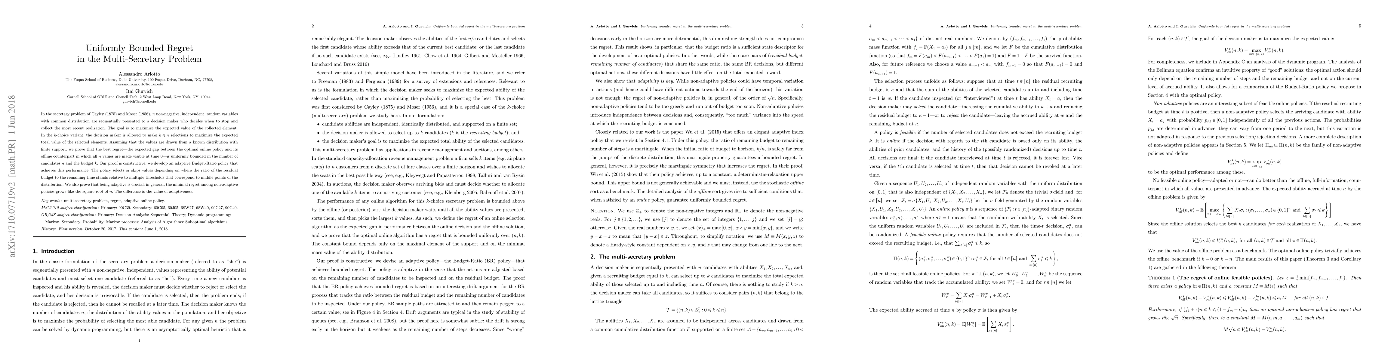 In the secretary problem of Cayley (1875) and Moser (1956), $n$ non-negative, independent, random variables with common distribution are sequentially presented to a decision maker who decides when to stop and collect the most recent realization. The goal is to maximize the expected value of the collected element. In the $k$-choice variant, the decision maker is allowed to make $k \leq n$ selections to maximize the expected total value of the selected elements. Assuming that the values are drawn from a known distribution with finite support, we prove that the best regret---the expected gap between the optimal online policy and its offline counterpart in which all $n$ values are made visible at time $0$---is uniformly bounded in the the number of candidates $n$ and the budget $k$. Our proof is constructive: we develop an adaptive Budget-Ratio policy that achieves this performance. The policy selects or skips values depending on where the ratio of the residual budget to the remaining time stands relative to multiple thresholds that correspond to middle points of the distribution. We also prove that being adaptive is crucial: in general, the minimal regret among non-adaptive policies grows like the square root of $n$. The difference is the value of adaptiveness.