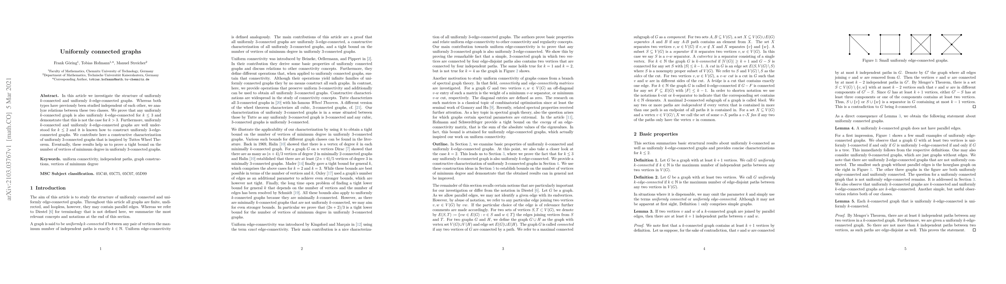 A constructive characterization of uniform 3-connected graphs was developed using a combination of graph theory and combinatorial techniques.