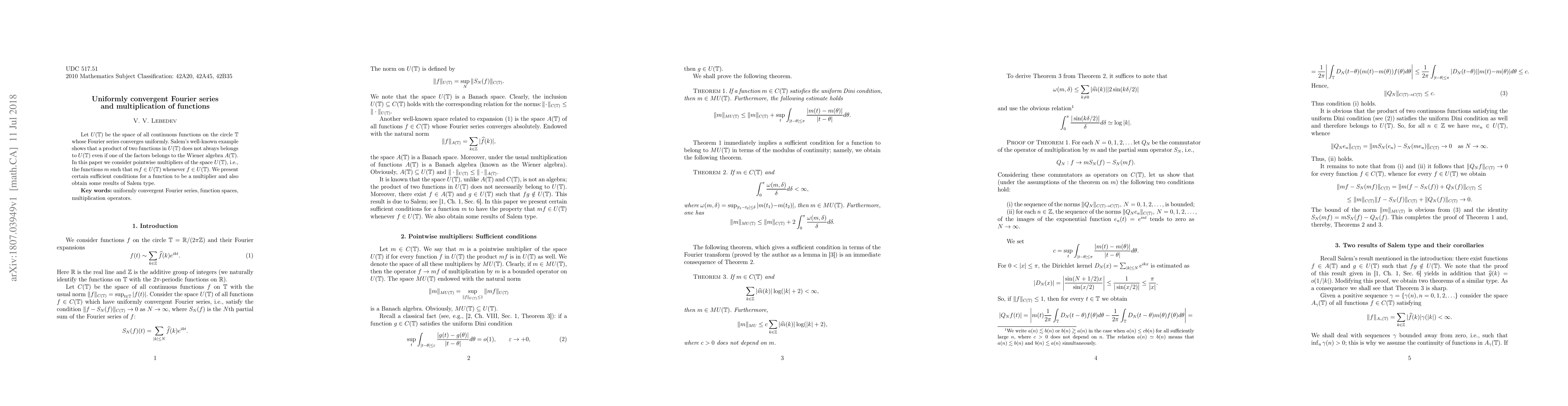 Let $U(\mathbb T)$ be the space of all continuous functions on the circle $\mathbb T$ whose Fourier series converges uniformly. Salem's well-known example shows that a product of two functions in $U(\mathbb T)$ does not always belongs to $U(\mathbb T)$ even if one of the factors belongs to the Wiener algebra $A(\mathbb T)$. In this paper we consider pointwise multipliers of the space $U(\mathbb T)$, i.e., the functions $m$ such that $mf\in U(\mathbb T)$ whenever $f\in U(\mathbb T)$. We present certain sufficient conditions for a function to be a multiplier and also obtain some results of Salem type.