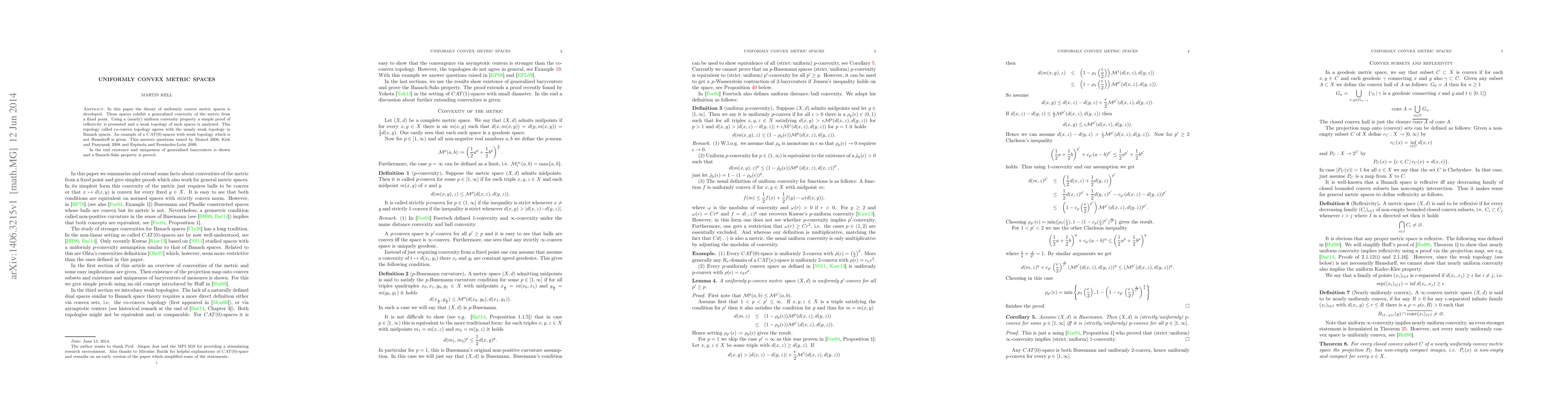 This paper develops the theory of uniformly convex metric spaces, proving their reflexivity and analyzing their co-convex topology, which aligns with Banach spaces' weak topology. It also addresses prior questions regarding $CAT(0)$-spaces and establishes the existence and uniqueness of generalized barycenters along with a Banach-Saks property.