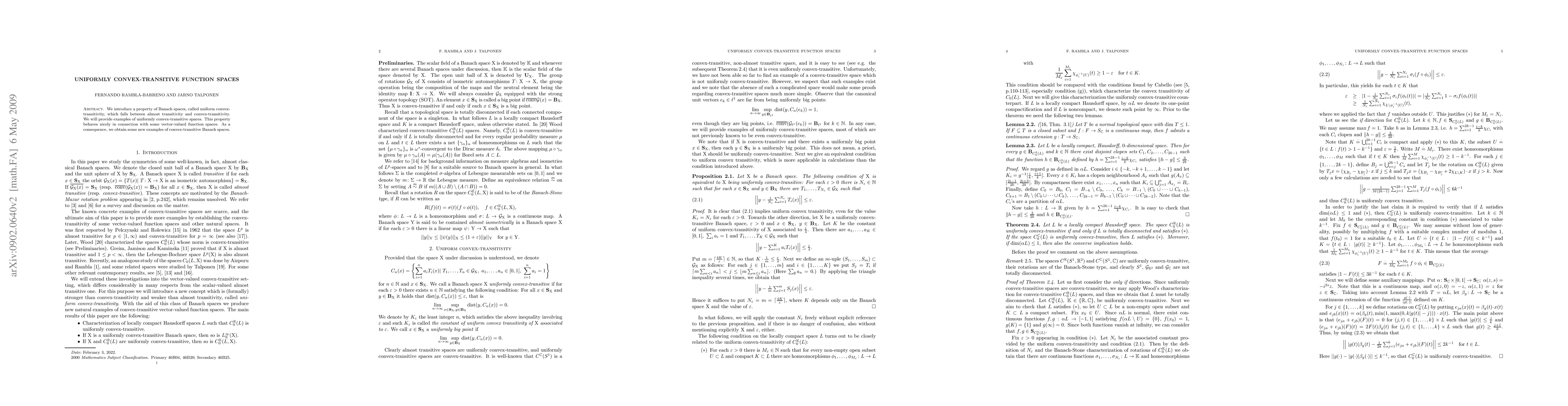 This paper introduces the concept of uniformly convex-transitive Banach spaces, a property lying between almost transitivity and convex-transitivity. It provides examples of such spaces and demonstrates their beneficial behavior in relation to Banach-valued function spaces, leading to new examples of convex-transitive Banach spaces.