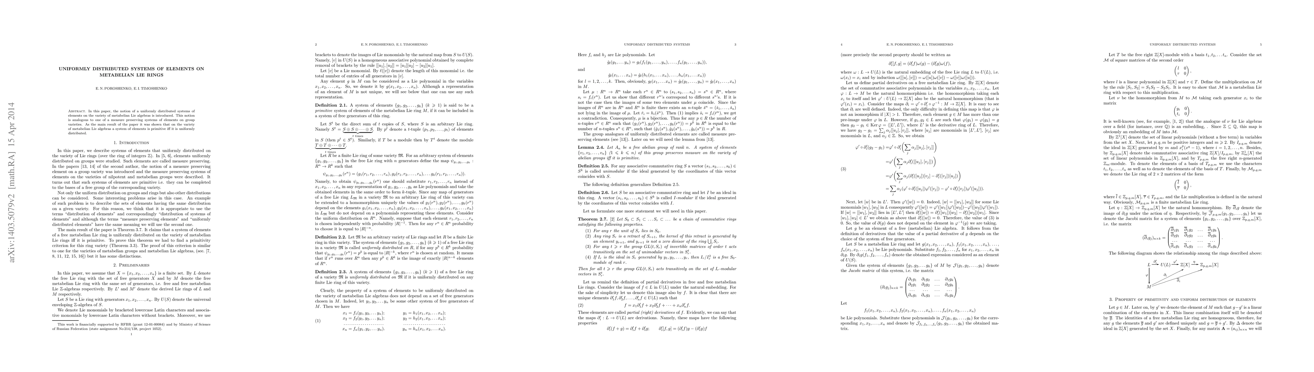 This paper introduces the concept of uniformly distributed systems of elements on metabelian Lie algebras, analogous to measure-preserving systems on group varieties. The key finding is that a system of elements is primitive on this variety if and only if it is uniformly distributed.