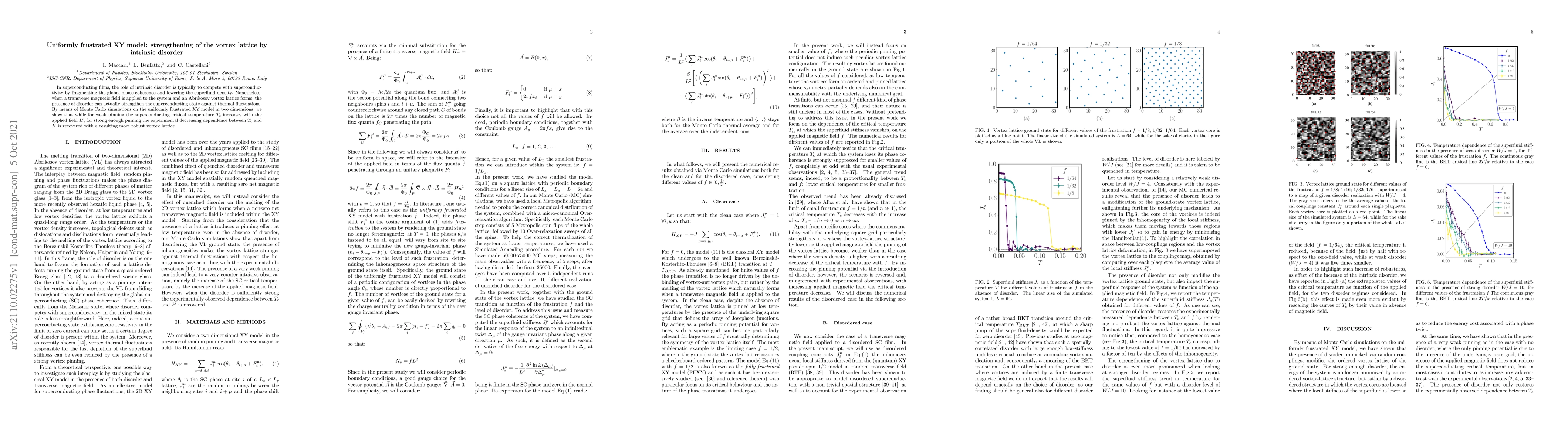 This study demonstrates that intrinsic disorder in superconducting films can strengthen the vortex lattice under a transverse magnetic field, enhancing the superconducting critical temperature $T_c$ for weak pinning and recovering a robust vortex lattice for strong pinning, as shown through Monte Carlo simulations of the uniformly frustrated XY model.