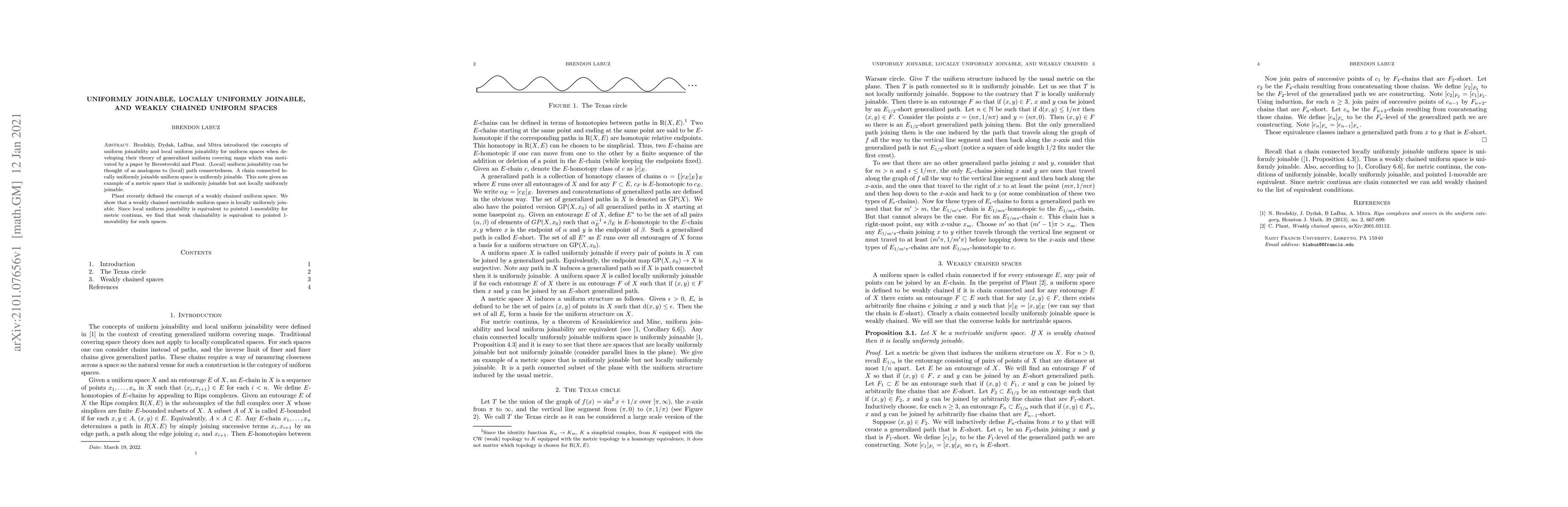Brodskiy, Dydak, LaBuz, and Mitra introduced the concepts of uniform joinability and local uniform joinability for uniform spaces when developing their theory of generalized uniform covering maps which was motivated by a paper by Berestovskii and Plaut. (Local) uniform joinability can be thought of as analogous to (local) path connectedness. A chain connected locally uniformly joinable uniform space is uniformly joinable. This note gives an example of a metric space that is uniformly joinable but not locally uniformly joinable. Plaut recently defined the concept of a weakly chained uniform space. We show that a weakly chained metrizable uniform space is locally uniformly joinable. Since local uniform joinability is equivalent to pointed 1-movability for metric continua, we find that weak chainability is equivalent to pointed 1-movability for such spaces.