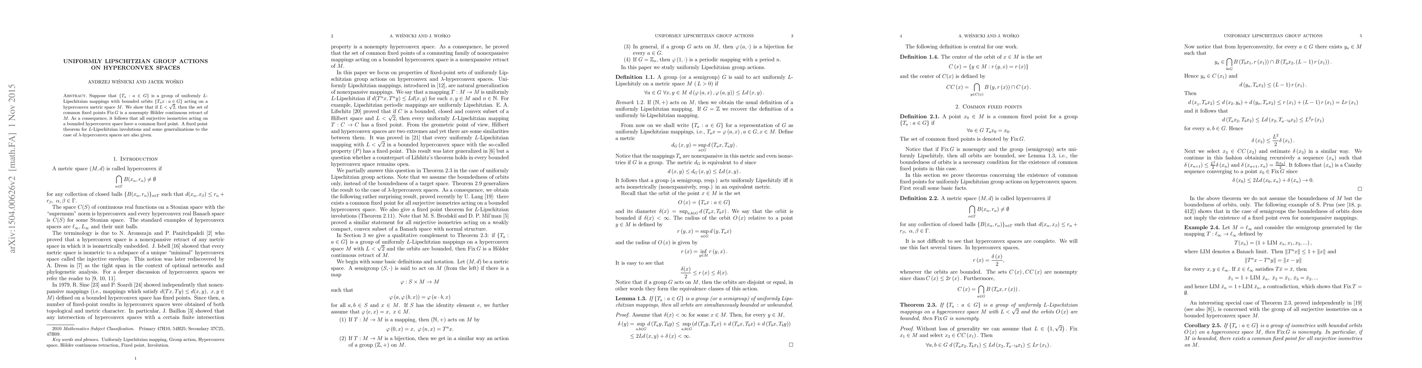 Suppose that $\{T_{a}:a\in G\}$ is a group of uniformly $L$-Lipschitzian mappings with bounded orbits $\left\{T_{a}x:a\in G\right\}$ acting on a hyperconvex metric space $M$. We show that if $L<\sqrt{2}$, then the set of common fixed points $Fix \, G$ is a nonempty H\"older continuous retract of $M$. As a consequence, it follows that all surjective isometries acting on a bounded hyperconvex space have a common fixed point. A fixed point theorem for $L$-Lipschitzian involutions and some generalizations to the case of $\lambda$-hyperconvex spaces are also given.