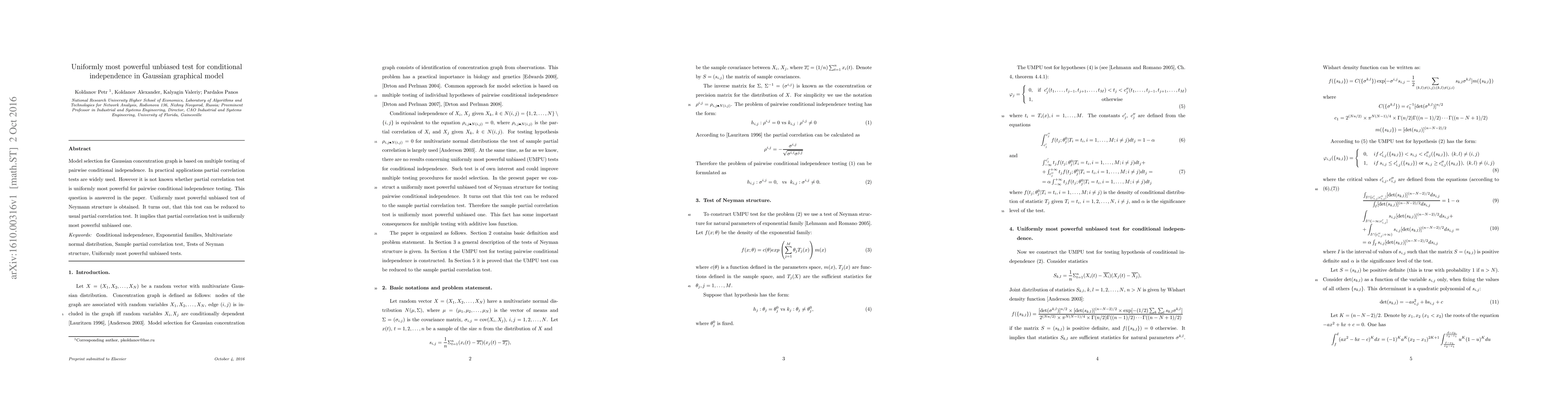 Model selection for Gaussian concentration graph is based on multiple testing of pairwise conditional independence. In practical applications partial correlation tests are widely used. However it is not known whether partial correlation test is uniformly most powerful for pairwise conditional independence testing. This question is answered in the paper. Uniformly most powerful unbiased test of Neymann structure is obtained. It turns out, that this test can be reduced to usual partial correlation test. It implies that partial correlation test is uniformly most powerful unbiased one.