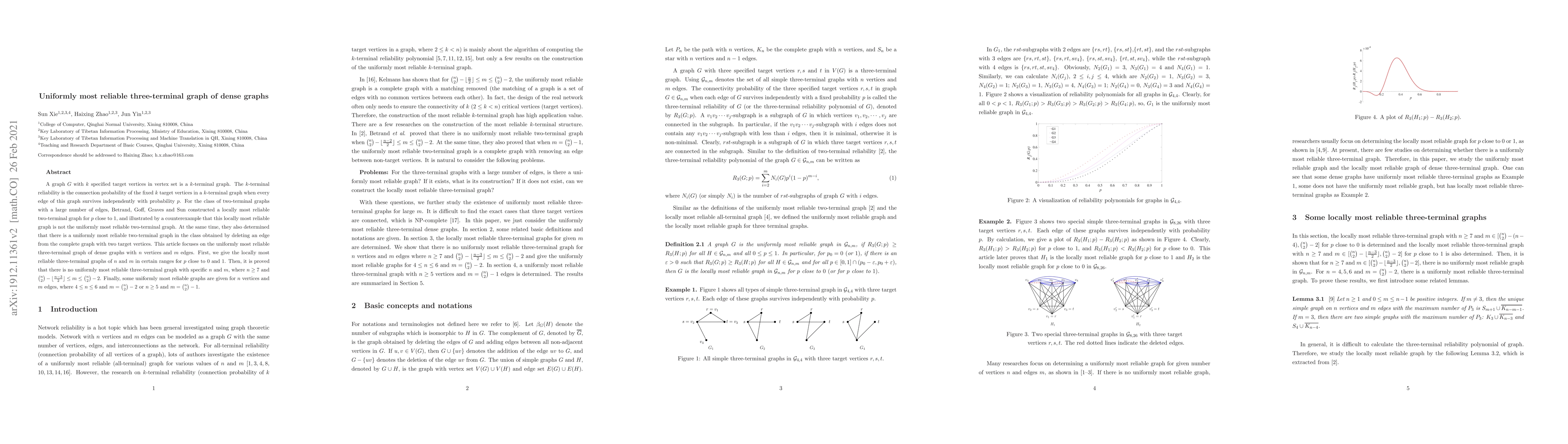 A graph $G$ with $k$ specified target vertices in vertex set is a $k$-terminal graph. The $k$-terminal reliability is the connection probability of the fixed $k$ target vertices in a $k$-terminal graph when every edge of this graph survives independently with probability $p$. For the class of two-terminal graphs with a large number of edges, Betrand, Goff, Graves and Sun constructed a locally most reliable two-terminal graph for $p$ close to $1$, and illustrated by a counterexample that this locally most reliable graph is not the uniformly most reliable two-terminal graph. At the same time, they also determined that there is a uniformly most reliable two-terminal graph in the class obtained by deleting an edge from the complete graph with two target vertices. This article focuses on the uniformly most reliable three-terminal graph of dense graphs with $n$ vertices and $m$ edges. First, we give the locally most reliable three-terminal graphs of $n$ and $m$ in certain ranges for $p$ close to $0$ and $1$. Then, it is proved that there is no uniformly most reliable three-terminal graph with specific $n$ and $m$, where $n\geq7$ and $\binom{n}{2}-\lfloor\frac{n-3}{2}\rfloor\leq m\leq\binom{n}{2}-2$. Finally, some uniformly most reliable graphs are given for $n$ vertices and $m$ edges, where $4\leq n\leq 6$ and $m=\binom{n}{2}-2$ or $n\geq5$ and $m=\binom{n}{2}-1$.