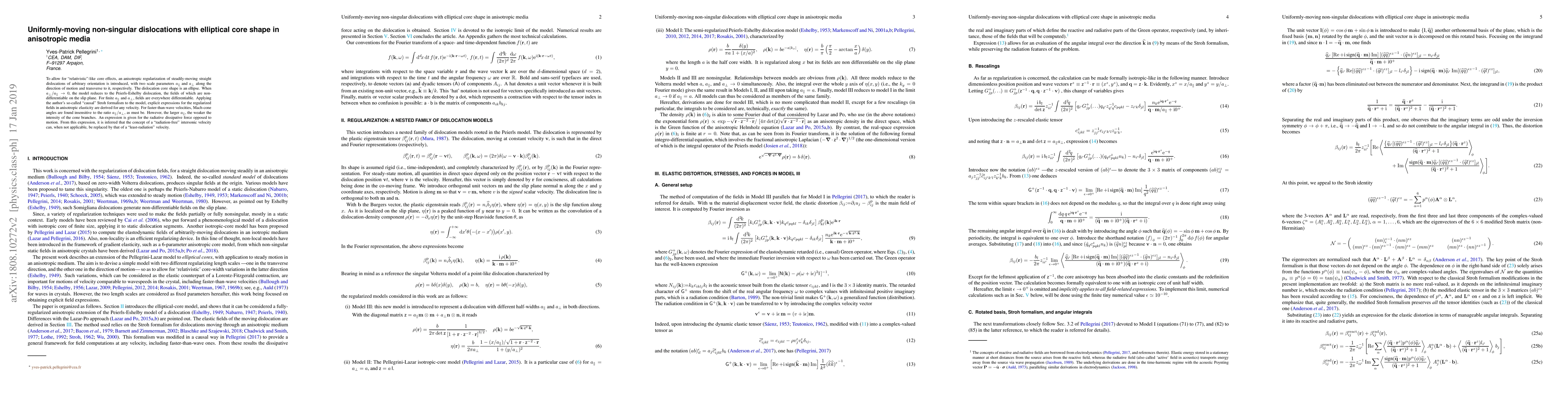 This research introduces an anisotropic regularization model for steadily-moving dislocations with elliptical core shape, ensuring differentiability of fields everywhere. It derives explicit expressions for regularized fields using the 'causal' Stroh formalism, applicable for any velocity. The study reveals that Mach-cone angles remain unaffected by the ratio of scale parameters a_parallel/a_perpendicular for faster-than-wave velocities. It also proposes the concept of 'least-radiation' velocity as an alternative to 'radiation-free' intersonic velocity, based on dissipative force expression.