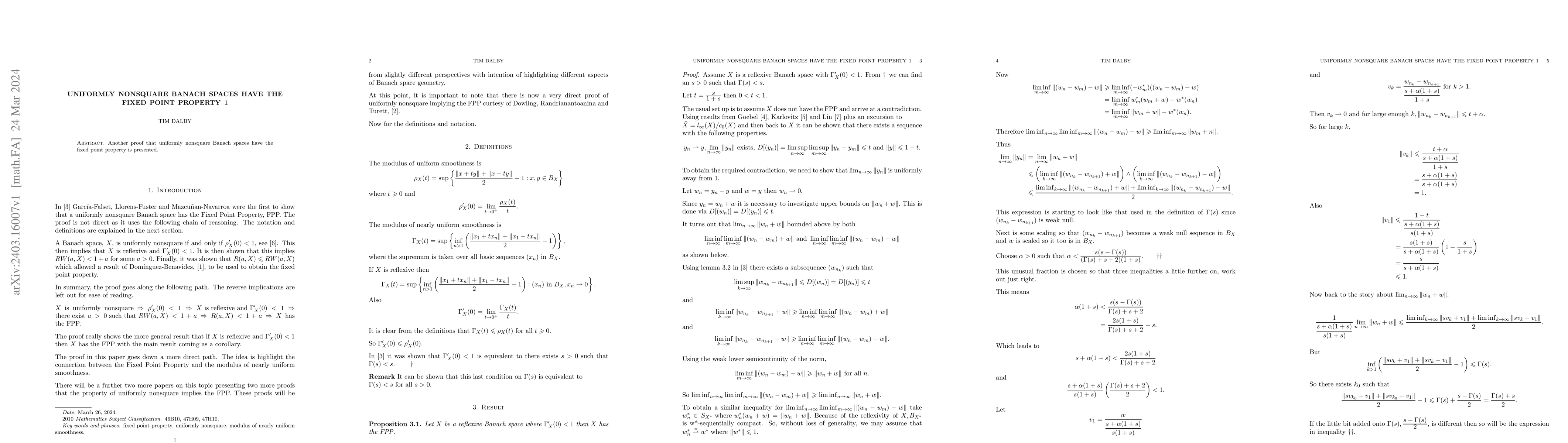 Summary: This paper provides an alternative proof demonstrating that uniformly nonsquare Banach spaces possess the fixed point property, contributing to the understanding of fixed point theory in functional analysis.