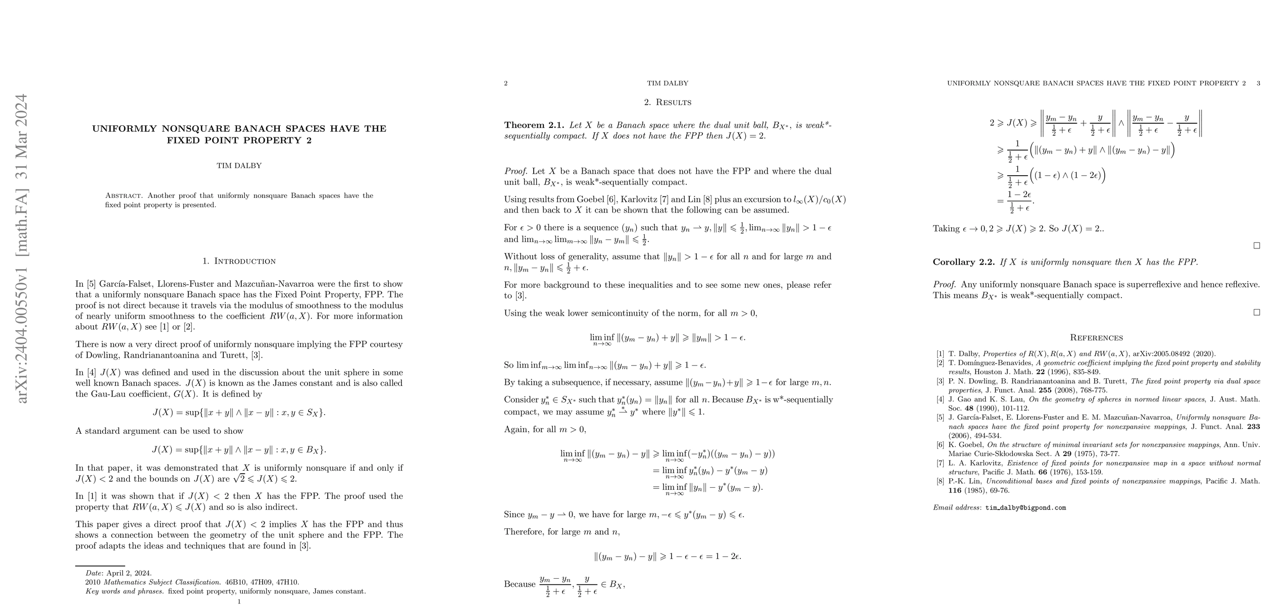 Summary: This paper provides an additional proof that uniformly nonsquare Banach spaces possess the fixed point property, contributing to the understanding of the structural characteristics of such spaces.