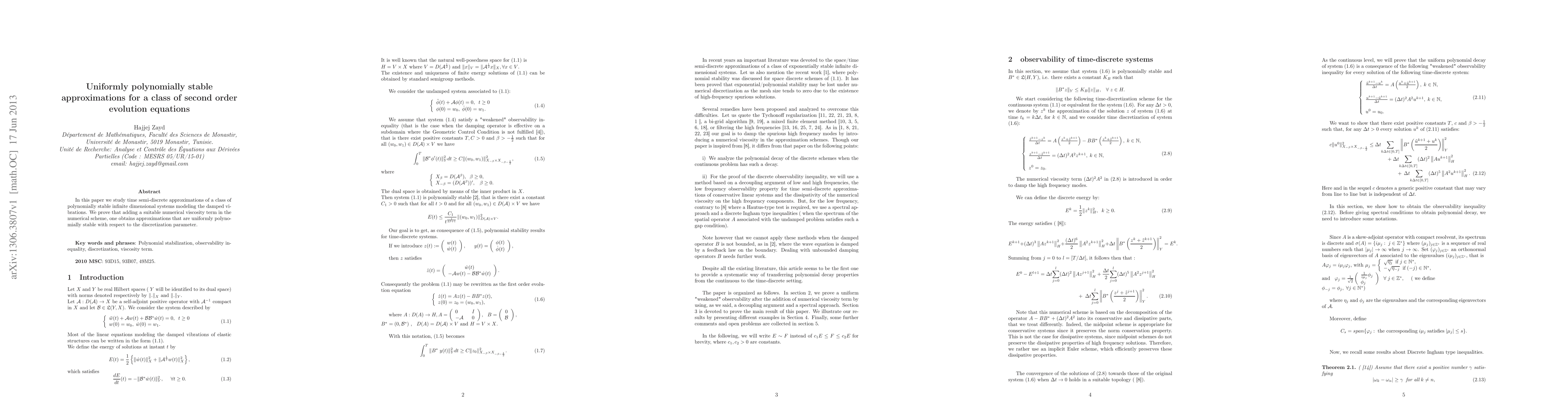 In this paper we study time semi-discrete approximations of a class of polynomially stable infinite dimensional systems modeling the damped vibrations. We prove that adding a suitable numerical viscosity term in the numerical scheme, one obtains approximations that are uniformly polynomially stable with respect to the discretization parameter.