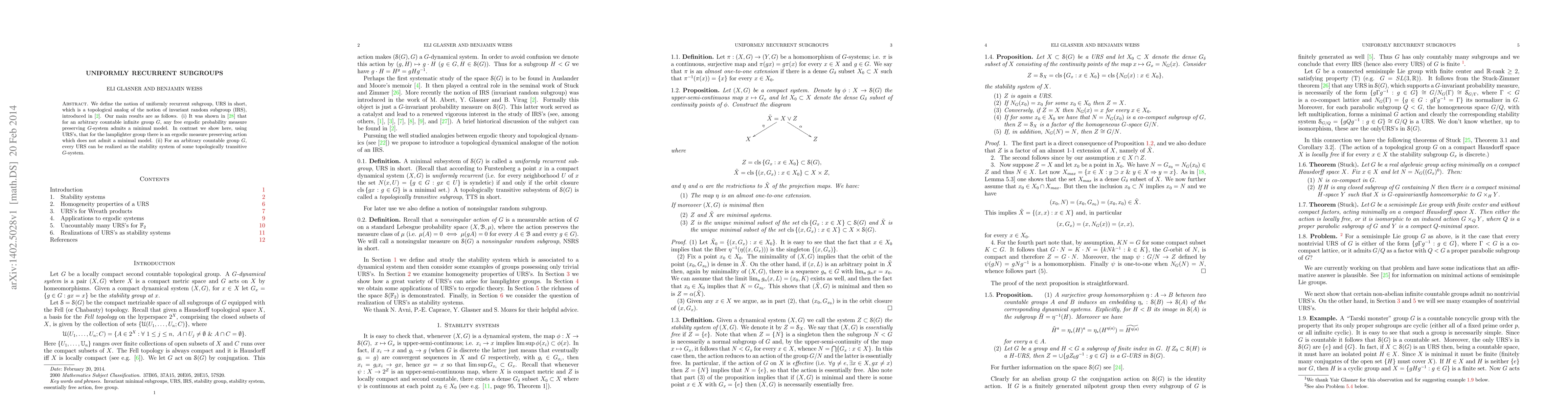 We define the notion of uniformly recurrent subgroup, URS in short, which is a topological analog of the notion of invariant random subgroup (IRS), introduced in a work of M. Abert, Y. Glasner and B. Virag. Our main results are as follows. (i) It was shown by B. Weiss that for an arbitrary countable infinite group G, any free ergodic probability measure preserving G-system admits a minimal model. In contrast we show here, using URS's, that for the lamplighter group there is an ergodic measure preserving action which does not admit a minimal model. (ii) For an arbitrary countable group G, every URS can be realized as the stability system of some topologically transitive G-system.