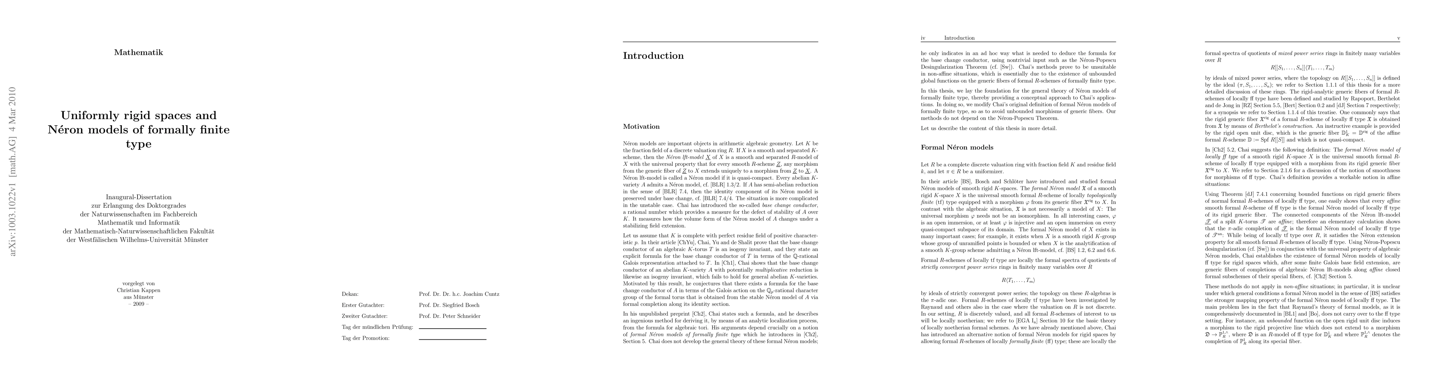 We introduce a new category of non-archimedean analytic spaces over a complete discretely valued field. These spaces, which we call uniformly rigid, may be viewed as classical rigid-analytic spaces together with an additional uniform structure: On the level of points, a uniformly rigid space coincides with its underlying rigid space, while its G-topology is coarser and its sheaf of holomorphic functions is smaller. A uniformly rigid structure is, locally, induced by an integral formal model of formally finite type. In fact, Berthelot's generic fiber functor factors naturally through the category of uniformly rigid spaces. The uniformly rigid generic fiber of a quasi-compact formal scheme of formally finite type is quasi-compact, and its global functions are bounded. We construct our new category by starting out from semi-affinoid algebras and nested rational coverings; we prove a uniformly rigid acyclicity theorem, and we study coherent modules. We then define formal N\'eron models for uniformly rigid spaces to be smooth formal schemes of formally finite type satisfying the universal N\'eron property. We establish the existence of formal N\'eron models for certain classes of uniformly rigid groups, and we discuss applications to Chai's program concerning the computation of the base change conductor for abelian varieties with potentially multiplicative reduction. This paper is a faithful copy of the author's doctoral thesis.