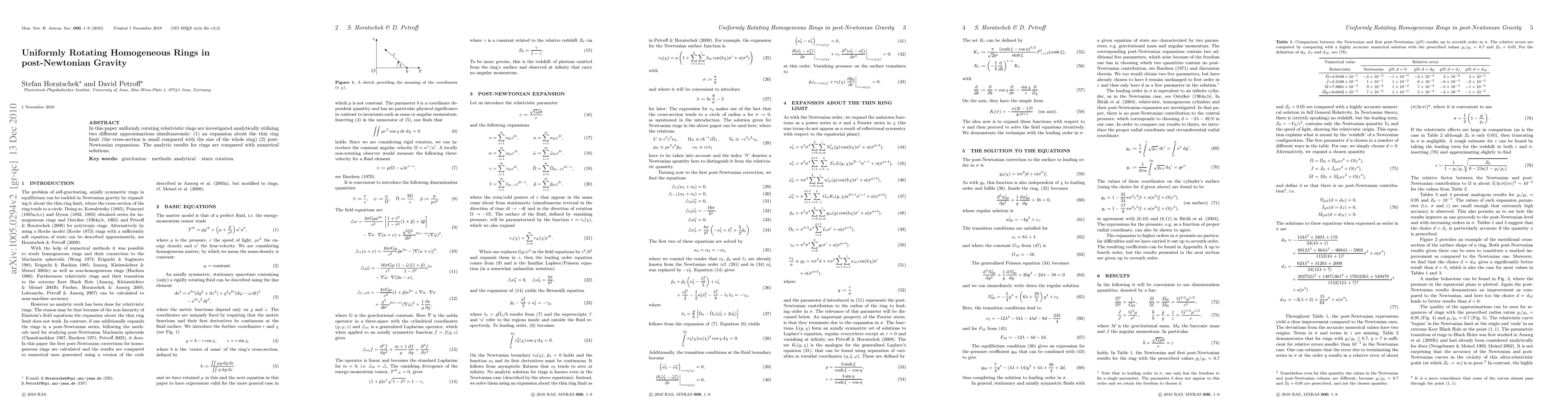 In this paper uniformly rotating relativistic rings are investigated analytically utilizing two different approximations simultaneously: (1) an expansion about the thin ring limit (the cross-section is small compared with the size of the whole ring) (2) post-Newtonian expansions. The analytic results for rings are compared with numerical solutions.