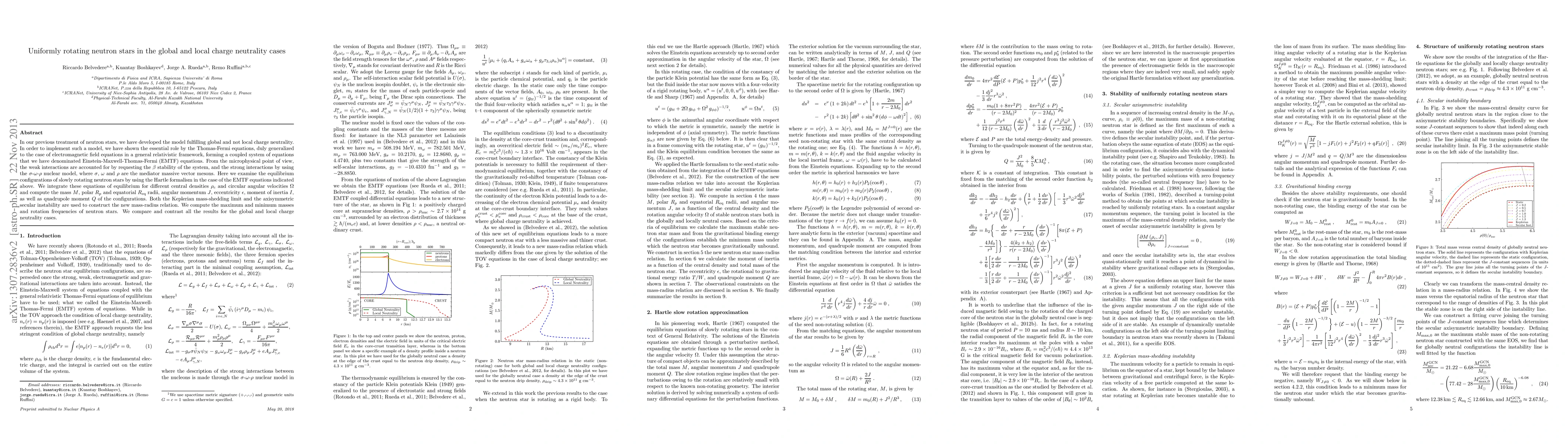 This paper investigates the equilibrium configurations of uniformly rotating neutron stars under global and local charge neutrality conditions using the Einstein-Maxwell-Thomas-Fermi (EMTF) equations. It computes various properties such as mass, radii, angular momentum, and quadrupole moments, and compares the results for different charge neutrality scenarios.