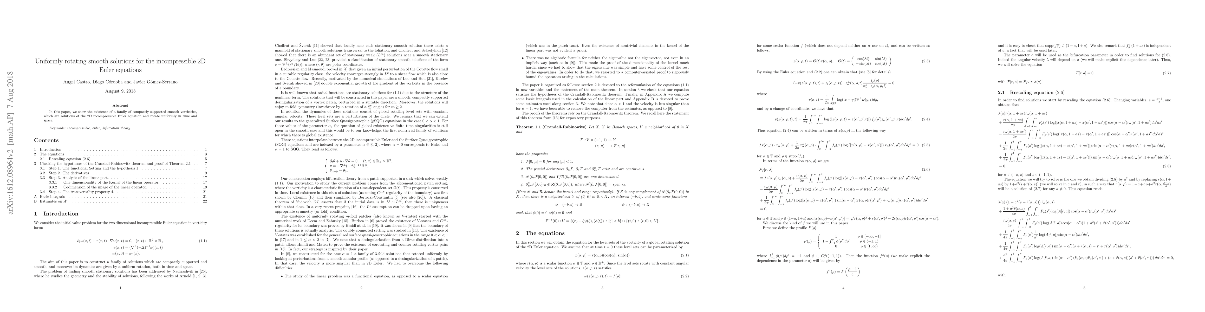 Summary: This paper demonstrates the existence of smooth, compactly supported vorticities that uniformly rotate in time and space, serving as solutions to the 2D incompressible Euler equations. These findings contribute to understanding rotational dynamics in fluid dynamics.