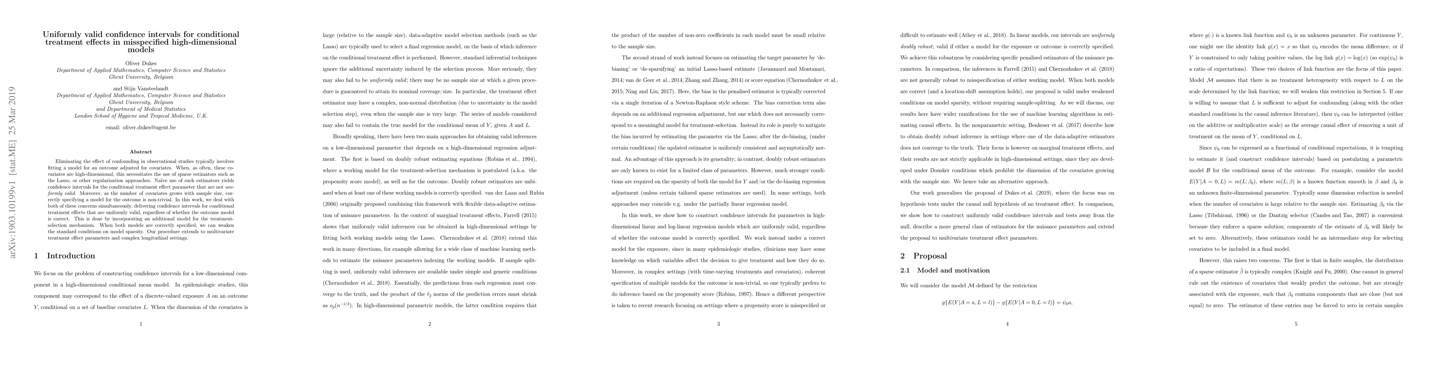 Eliminating the effect of confounding in observational studies typically involves fitting a model for an outcome adjusted for covariates. When, as often, these covariates are high-dimensional, this necessitates the use of sparse estimators such as the Lasso, or other regularisation approaches. Naiive use of such estimators yields confidence intervals for the conditional treatment effect parameter that are not uniformly valid. Moreover, as the number of covariates grows with sample size, correctly specifying a model for the outcome is non-trivial. In this work, we deal with both of these concerns simultaneously, delivering confidence intervals for conditional treatment effects that are uniformly valid, regardless of whether the outcome model is correct. This is done by incorporating an additional model for the treatment-selection mechanism. When both models are correctly specified, we can weaken the standard conditions on model sparsity. Our procedure extends to multivariate treatment effect parameters and complex longitudinal settings.