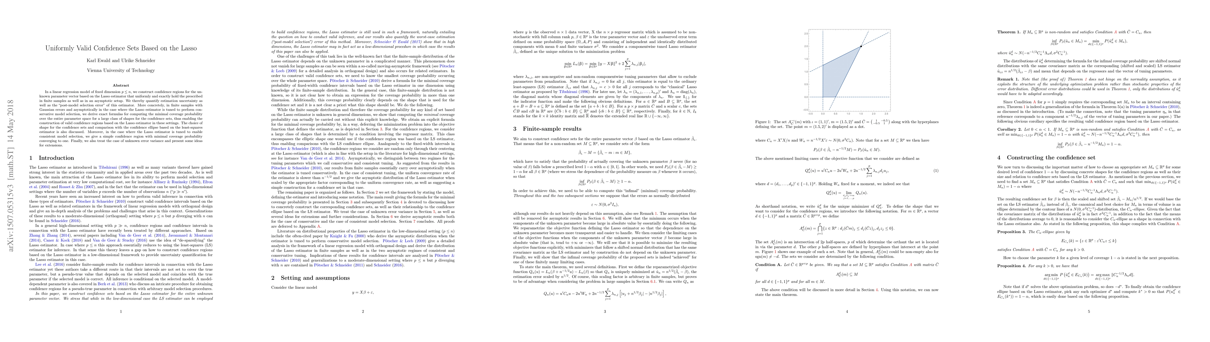 This paper constructs uniformly valid confidence regions for the Lasso estimator in linear regression, ensuring exact coverage in both finite and asymptotic settings. It quantifies estimation uncertainty and post-model selection error, providing exact formulas for minimal coverage probability and discussing the choice of confidence set shapes compared to least-squares estimators.