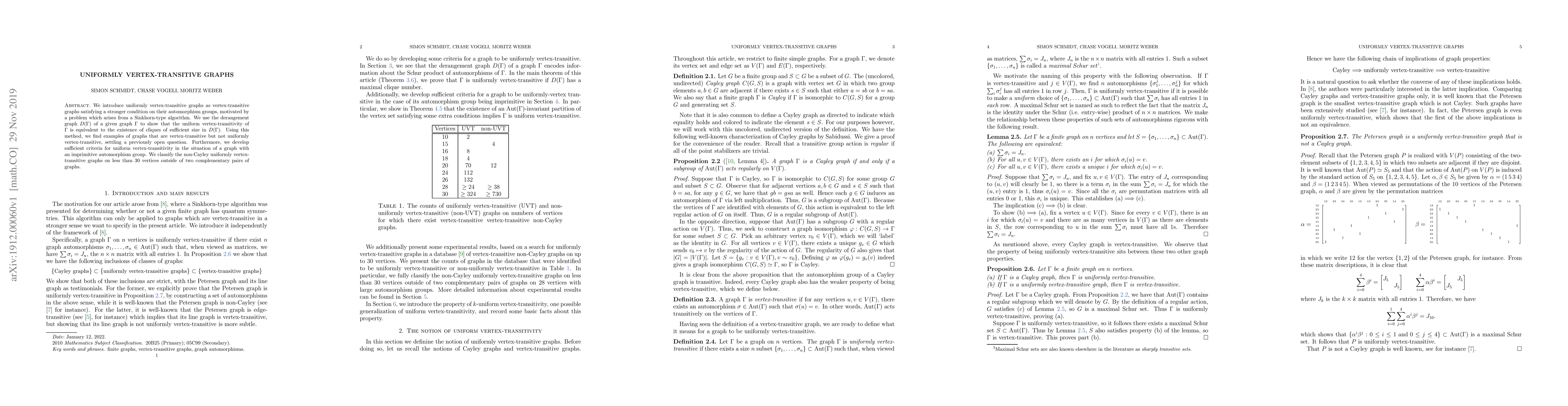The paper introduces uniformly vertex-transitive graphs, characterized by stronger automorphism group properties, and resolves open questions regarding their existence. It classifies non-Cayley uniformly vertex-transitive graphs on fewer than 30 vertices and uses derangement graphs to identify necessary clique sizes for uniform vertex-transitivity.