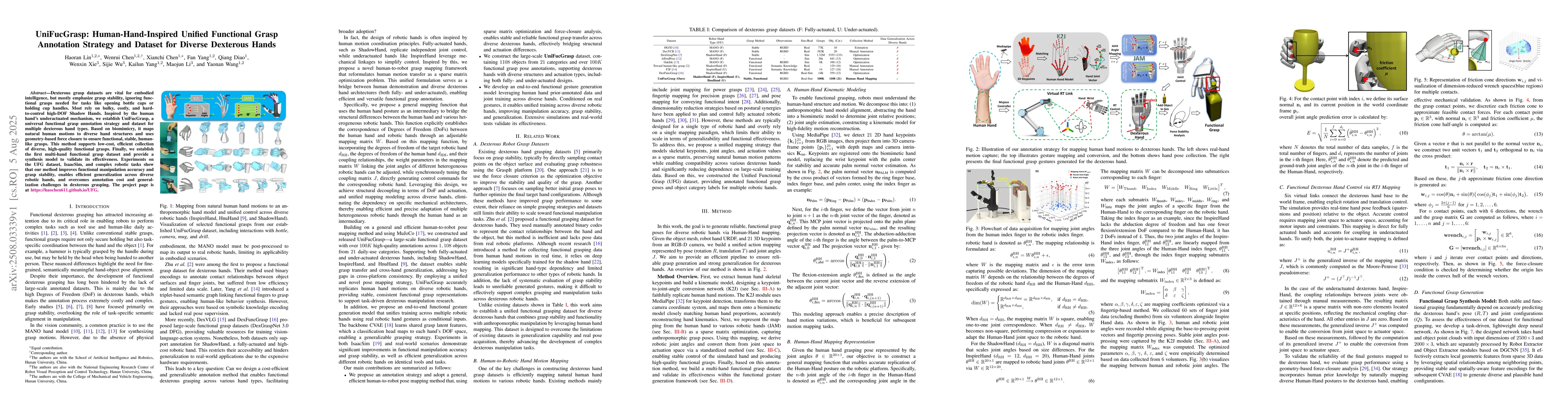 Dexterous grasp datasets are vital for embodied intelligence, but mostly emphasize grasp stability, ignoring functional grasps needed for tasks like opening bottle caps or holding cup handles. Most rely on bulky, costly, and hard-to-control high-DOF Shadow Hands. Inspired by the human hand's underactuated mechanism, we establish UniFucGrasp, a universal functional grasp annotation strategy and dataset for multiple dexterous hand types. Based on biomimicry, it maps natural human motions to diverse hand structures and uses geometry-based force closure to ensure functional, stable, human-like grasps. This method supports low-cost, efficient collection of diverse, high-quality functional grasps. Finally, we establish the first multi-hand functional grasp dataset and provide a synthesis model to validate its effectiveness. Experiments on the UFG dataset, IsaacSim, and complex robotic tasks show that our method improves functional manipulation accuracy and grasp stability, enables efficient generalization across diverse robotic hands, and overcomes annotation cost and generalization challenges in dexterous grasping. The project page is at https://haochen611.github.io/UFG.