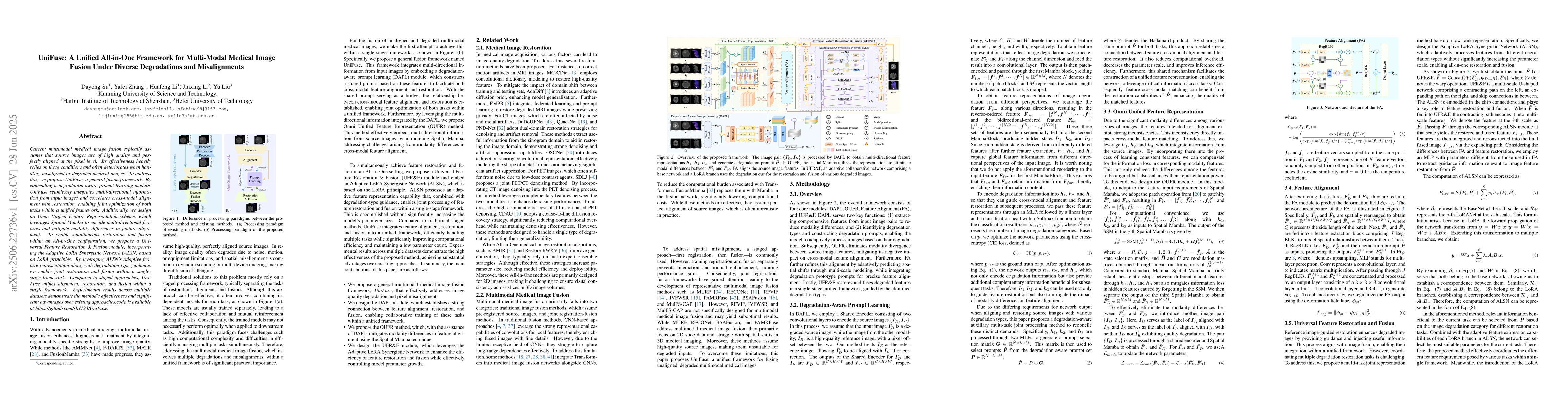 Current multimodal medical image fusion typically assumes that source images are of high quality and perfectly aligned at the pixel level. Its effectiveness heavily relies on these conditions and often deteriorates when handling misaligned or degraded medical images. To address this, we propose UniFuse, a general fusion framework. By embedding a degradation-aware prompt learning module, UniFuse seamlessly integrates multi-directional information from input images and correlates cross-modal alignment with restoration, enabling joint optimization of both tasks within a unified framework. Additionally, we design an Omni Unified Feature Representation scheme, which leverages Spatial Mamba to encode multi-directional features and mitigate modality differences in feature alignment. To enable simultaneous restoration and fusion within an All-in-One configuration, we propose a Universal Feature Restoration & Fusion module, incorporating the Adaptive LoRA Synergistic Network (ALSN) based on LoRA principles. By leveraging ALSN's adaptive feature representation along with degradation-type guidance, we enable joint restoration and fusion within a single-stage framework. Compared to staged approaches, UniFuse unifies alignment, restoration, and fusion within a single framework. Experimental results across multiple datasets demonstrate the method's effectiveness and significant advantages over existing approaches.