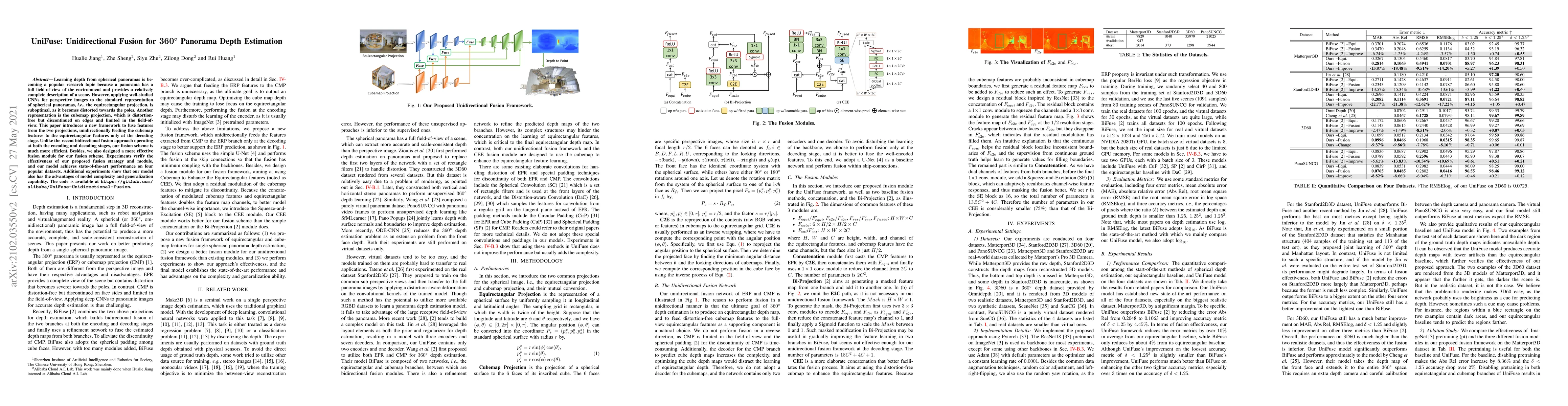 This paper introduces UniFuse, a unidirectional fusion framework for 360$^{ extcirc}{}$ panorama depth estimation that achieves state-of-the-art performance on four popular datasets.