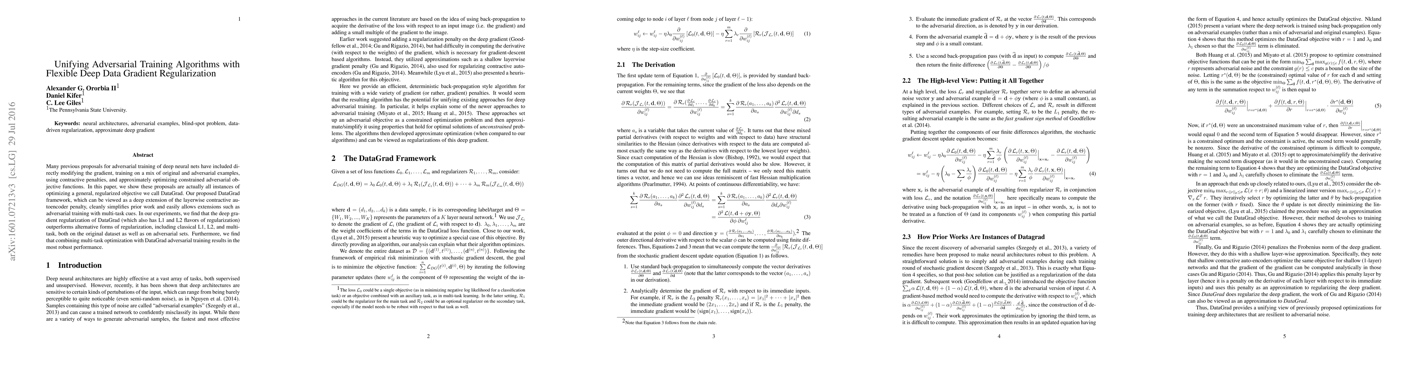 Many previous proposals for adversarial training of deep neural nets have included di- rectly modifying the gradient, training on a mix of original and adversarial examples, using contractive penalties, and approximately optimizing constrained adversarial ob- jective functions. In this paper, we show these proposals are actually all instances of optimizing a general, regularized objective we call DataGrad. Our proposed DataGrad framework, which can be viewed as a deep extension of the layerwise contractive au- toencoder penalty, cleanly simplifies prior work and easily allows extensions such as adversarial training with multi-task cues. In our experiments, we find that the deep gra- dient regularization of DataGrad (which also has L1 and L2 flavors of regularization) outperforms alternative forms of regularization, including classical L1, L2, and multi- task, both on the original dataset as well as on adversarial sets. Furthermore, we find that combining multi-task optimization with DataGrad adversarial training results in the most robust performance.