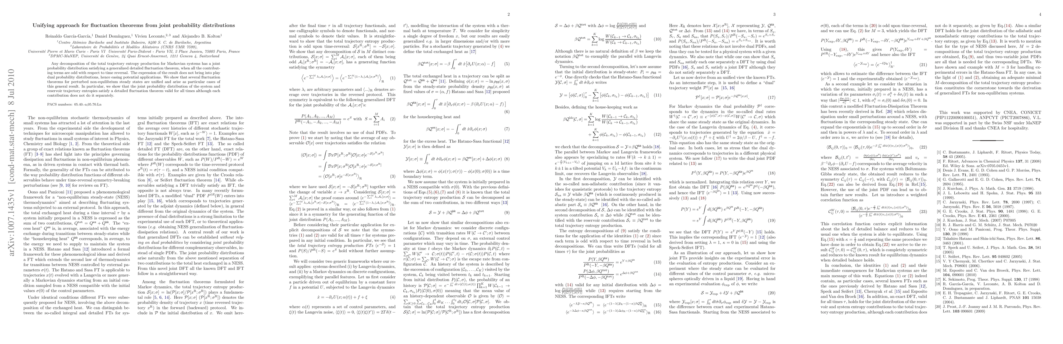 This paper presents a unified approach to fluctuation theorems using joint probability distributions, demonstrating that any decomposition of entropy production in Markovian systems adheres to a generalized detailed fluctuation theorem when terms are odd under time reversal. The method simplifies applications by avoiding dual probability distributions and unifies various fluctuation theorems for perturbed non-equilibrium steady states.