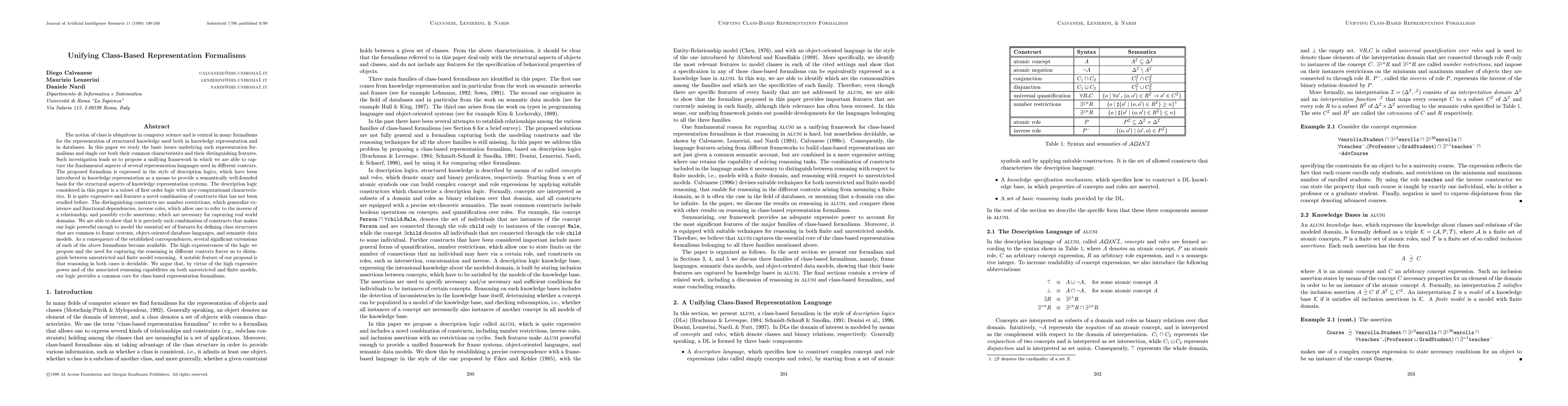 This paper proposes a unifying framework based on a novel description logic to capture the fundamental aspects of various class-based representation formalisms, including frame systems, object-oriented database languages, and semantic data models. The logic features expressive constructs like number restrictions, inverse roles, and cyclic assertions, ensuring decidable reasoning in both unrestricted and finite models.